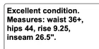 Excellent condition. Measures: waist 36+, hips 44, rise 9.25, inseam 26.5". THANK YOU EBAY!!! We are so thankful for our customers! We have thousands of listings, and therefore receive hundreds of messages, every single day. So, if you are asking about a price drop, or a shipping price drop, or asking for extra measurements, or to add additional photos, please allow me to answer you here, No thanks. If your question is not one of those questions, we will be /happy to answer you individually. YES...WE DO COMBINE DOMESTIC SHIPPING. Extra jewelry items ship for $2 each (except for large jewelry lots). We will refund the difference as we are mailing out.....we hope you enjoy shopping with us! We encourage you to read the description and check all photos.