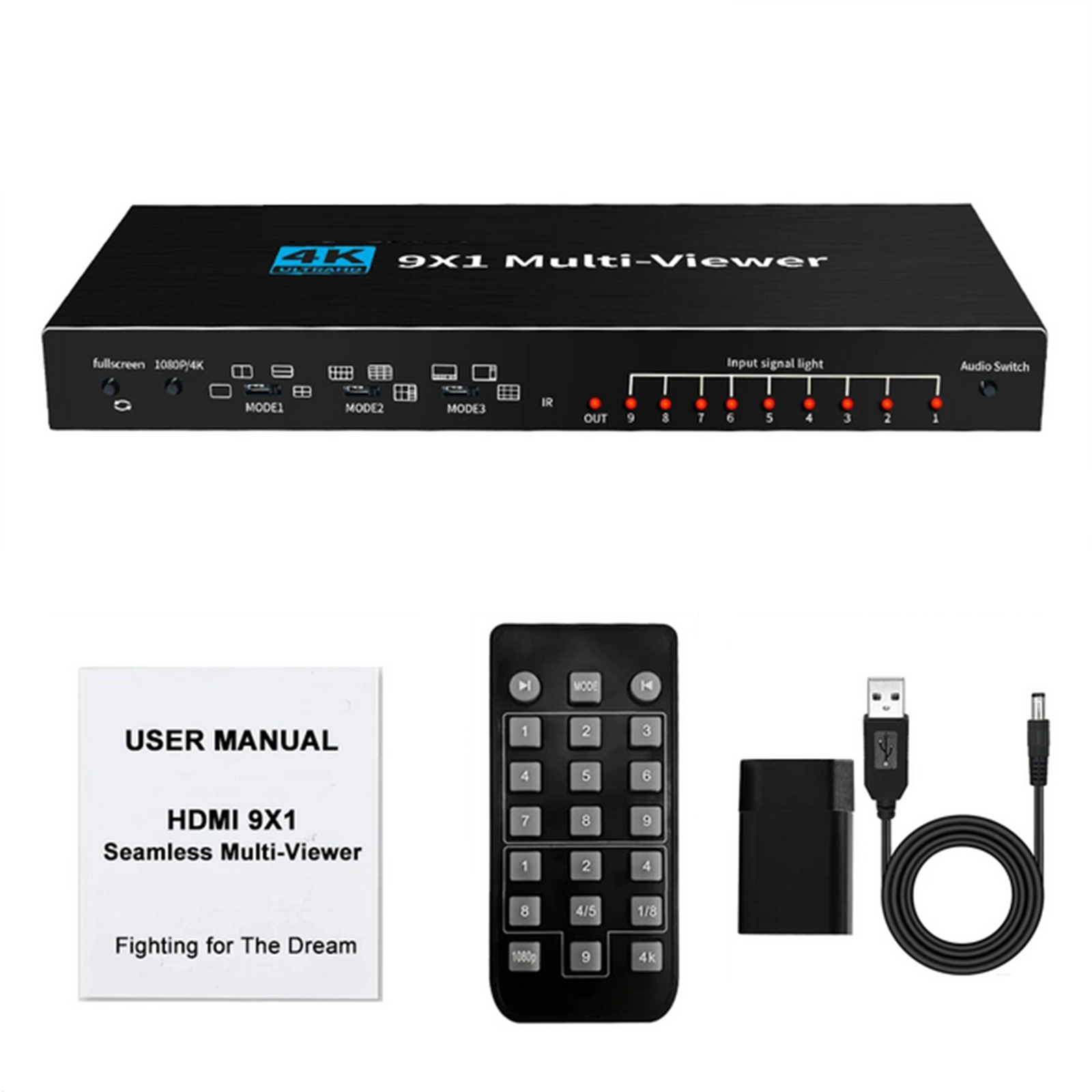 Product Description 4K 30hz 9x1 HDMI-compatible Multiviewer 4K 9 In 1 Out 1080P Screen Multi Viewer HDMI Multi-Viewer Seamless Switch With IR Specifications: Support HDMI resolution: 4K30HZ/1080P/1080i/720p/576p/576i/480p/480i Support video color format: 24bit/30bit/36bit Support audio input format: DTS-HD/Dolby-realHD/Dolby-AC3/DSD Support audio output format: LPCM, PCM2 Max bandwidth: 330Mhz Max bandrate: 10.2Gbps Input/Output TMDS signal: 0.5~1.5V p-p(TTL) Input/Output DDC signal: 5Volts p-p(TTL) Input cable distance: ≤ 3m AWG24 HDMI standard cable Output cable distance: ≤ 3m AWG24 HDMI standard cable Max working current: 5V/0.6A Power supply: DC5V2A Remote control battery: 1*CR2025 Battery (Not included) Operating Temperature range: -15°C ~ +55°C Operating Humidity range: 5~90%RH(No Condensation)) Dimension(L x W x H): 148*63*23mm Features: 1. 10 Ways Viewing Screen: 9X1 Quad MultiView Selector support 10 viewing modes. You could see 9 HDMI input sources screen on one monitor by 10 ways, also can only see only one HDMI input source by full screen 2. HDMI Switch 9 in 1 out: 9 HDMI Input ports, 1 HDMI output port. Support Connect 9 HDMI input device and one HDMI Display device on Switch box, avoid frequently plugging and unplugging on HDMI Display device 3. Remote Control and Button Control: 9x1 Quad Multi-Viewer with function buttons and attached IR remote control. Manual button and remote control both support switching input source, selecting full screen mode or quad modes and switch input source's audio 4. Max up to 4K 30Hz Resolution: HDMI Multiple display Switch box support 3840x2160@30Hz, 1080P@60Hz, 1080i, 720p, 567p, 576i, 480p, 480i, bandrate max to 10.2Gbps, Support Color format 24 bit/30 bit/ 36bit 5. Widely Compatible: HDMI 9X1 Quad Multi-viewer support HDMI 1.4 and HDCP 1.4 and backward Package List: 1x HDMI 9x1 Multi-viewer 1x DC 5V/2A Power Adapter 1x Power Cable 1x User Manual 1x Remote Control(CR2025 Battery Not included) Shipping Returns Contact Us Payment 1. Items sent from US warehouse. 2. Receiving time = Processing time + Shipping time. 3. Pro cessing Time: Around 1-2 business Days. 4. Shipping Time: 3-5 business day. it may have a little delay during some holiday (such as Christmas), any problem, please feel free to contact. 1. 30 days warranty from the purchased date. Please contact us via email before returning the defective item. 2. Our warranty does not extended to any product that are physically damaged or that are not under normal operating conditions as result of misuse or improper installation on the buyer/user's part. 3. Return items should include the original packaging and all accessories. buyers MUST contact us for the returning address. 4. In all cases, buyers pay shipping fees at their own cost to return products for exchange or refund. We will be responsible for the postage of replacements. Refund will be made upon receipt of the returned item. If you have any question, please e-mail us immediately, we will reply you as quickly as possible. We care about our valued customers, and will always try to help you. We accept all verified payment from eBay. Shipping 1. Items sent from US warehouse. 2. Receiving time = Processing time + Shipping time. 3. Pro cessing Time: Around 1-2 business Days. 4. Shipping Time: 3-5 business day. it may have a little delay during some holiday (such as Christmas), any problem, please feel free to contact. Returns 1. 30 days warranty from the purchased date. Please contact us via email before returning the defective item. 2. Our warranty does not extended to any product that are physically damaged or that are not under normal operating conditions as result of misuse or improper installation on the buyer/user's part. 3. Return items should include the original packaging and all accessories. buyers MUST contact us for the returning address. 4. In all cases, buyers pay shipping fees at their own cost to return products for exchange or refund. We will be responsible for the postage of replacements. Refund will be made upon receipt of the returned item. Contact Us If you have any question, please e-mail us immediately, we will reply you as quickly as possible. We care about our valued customers, and will always try to help you. Payment We accept all verified payment from eBay. You may also like 5/16" Line Fuel Filter Replace Part For Mercury For Quicksilver Marine Engine 12.33 USD Housing Case Kit 5-Cell 18650 Replace For DeWalt 20V DCB201/203 Li-Ion Battery 17.63 USD 1.99 USD Wireless Remote Control DC 6V 12V 24V 2CH RF Relay Transmitter 433MHz Universal 15.06 USD New Laser Lens Deck Repair Part For Sony PlayStation 2 PS2 Slim PVR-802W 20.67 USD Gas Fireplace Thermocouple Universal Stove Thermocouple 600mm Grill Fireplace 11.89 USD Hi-Speed USB Port Socket Connector Without Wings For Xbox Series S Console 11.65 USD powered by