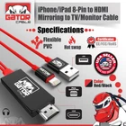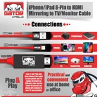 Gator Cable iPhone to HDMI Mirroring AV Cable iPhone & iPad to HDMI TV HDTV For: iPhone, iPad, iOS Cable Specifications: Length 6FT Lightning 8-Pin Connector Supports iPhone: 8/9/X/XR/XS/11/12/13/14/15/Pro/Max/Plus Supports Resolution: Full HD 1080P Easy to Use: Plug and Play. No need for WIFI, Hotspot or Cellular. Charging Function: C harge your iPhone/iPad while using. Wide Application: perfect for watching movies, sharing pictures or playing games on the big screen at home, office, school. Maximum Data Transfer Rate: 5.0Gbps Black Color PVC Molding Type Optimum Hard ABS Shell Casings Data Line 28 AWG, Power Line 24 AWG Gold/Silver Plated Connectors Supports Apple Lightning Devices: iPhone, iPad, iOS External Power Supply Required through USB-A Connector Features: 1. Easy to use - Plug and Play 2. For use with HDTV, Projector, Monitors, Displays, Home Theater System and all HDMI enabled devices. Applications and Compatible Models: iPhone 5 5S 5C iPhone 14 iPhone 6 6S 6+ 6S Plus iPhone 14 Plus iPhone 7 7+ Plus iPhone 14 Pro iPhone 8 8+ Plus iPhone 14 Pro Max iPhone X iPhone 12 iPhone XR iPhone 12 Pro iPhone XS iPhone 12 Pro Max iPhone XS Max iPhone 12 Mini iPhone 11 iPhone 13 iPhone 11 Pro iPhone 13 Pro iPhone 11 Pro Max iPhone 13 Pro Max iPad 1 2 3 4 iPhone 13 Mini iPad Mini 1 2 3 4 iPad Air Air 2 iPad Pro Included in Package: 1 x iPhone to HDMI Mirroring AV Cable 1 x User Manual We Offer The Lowest Prices On eBay for OPTIMUM Quality Cables + Free Shipping On All USA Orders! BUY 4 OR MORE GATOR CABLES GET FREE U.S. PRIORITY MAIL SHIPPING ALL ORDERS ARE SHIPPED OUT WITHIN 1 TO 8 HOURS! Ultra Fast - FREE Shipping Worldwide Shipping From USA to All USA International Shipping No Waiting 3 to 4 Weeks Hard Durable ABS Casing Strong-Rugged-Tough Heavy Duty Cables Premium Quality Cables iPhone-iPad to HDMI AV Mirroring Cable Adapter Ultimate Performance Great Value CLICK ON OUR eBay STORE