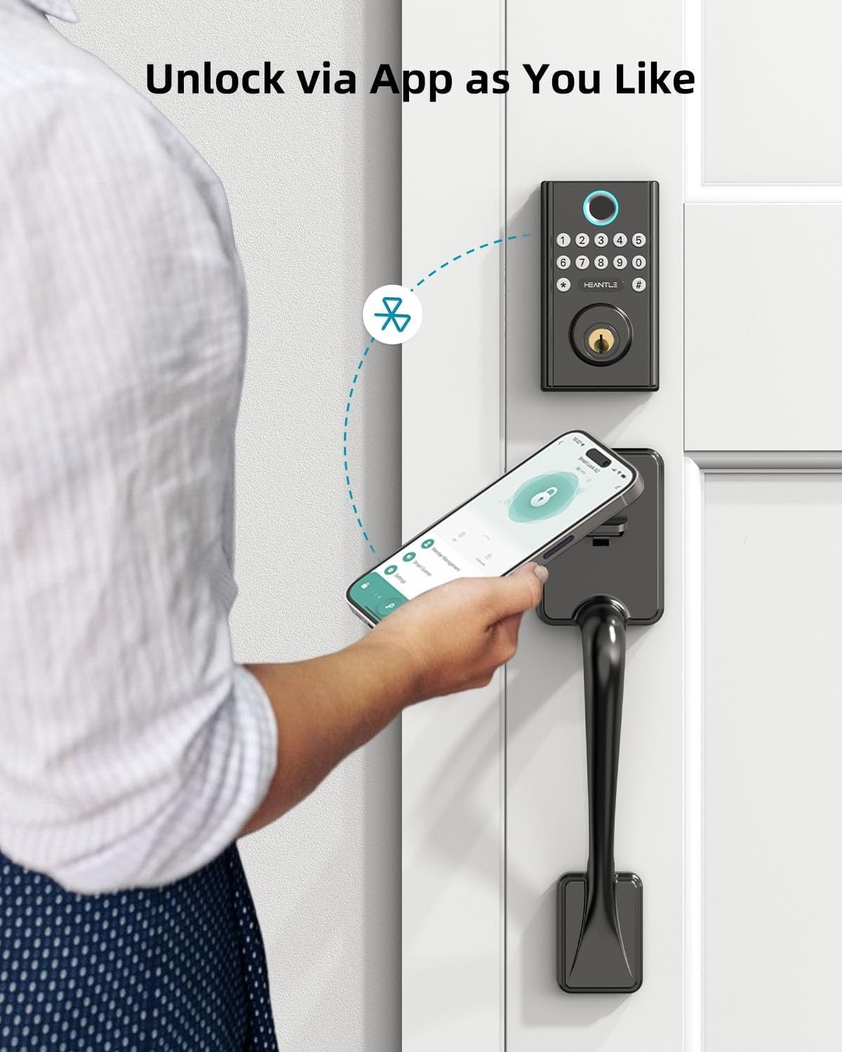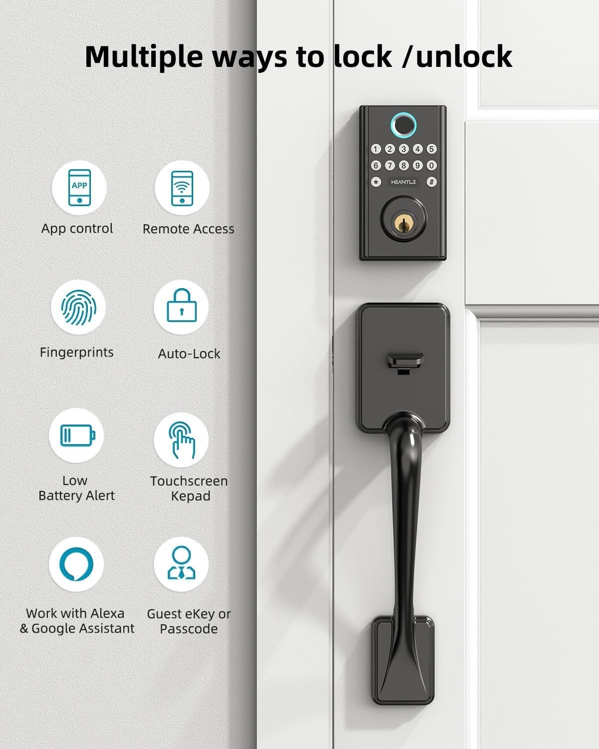 About this item : 【 Wi-Fi Remote & Voice Co ntrol 】Add G3 gateway (Included) to remote control via App, you can unlock or lock your door anytime, anywhere, while also working with Alexa/Google Home to enable voice control 【 10 in 1 Smart Lock Handle sets 】Features Bluetooth/Wifi APP Control + Fingerprints Unlock+ Anti-peep Passcode + Auto Lock + Passage Mode(keep unlocked) + Physical Key + Emergent Charge(USB-C) + Low Battery Alert (lower than 20%) + Wrong Entry Alert 【 Easy to Ins tall 】No extra hole drill for Smart deabolt Lock With Handle, Follow the steps with a detailed manual and installation video, replace an existing digital door lock in 10 minutes with just a phillips screwdriver 【 Auto Lo ck 】Monitor electronic door lock status anywhere via the app. Digital keypad door lock allowing you to set auto lock after 5 to 900 seconds or apply 1-touch motorized locking. No need to worry about whether locked 【 Ideal for Rental & Airb nb 】You can sync all your locks on the APP & Remotely unlock for your guests or family and customized your own access codes for your guests and grant admin users to share the management of smart front door lock set via their individual Phone accounts. 【 Reliable Service & Warra nty 】HEANTLE wifi smart door lock with handle provides 1-year warranty, 30 days free replacement, and Online Email technical support. Any questions, please feel free to contact us by email. We will reply within 24H. Specification s : Brand: HEANTLE Model: M2-BT Type: WiFi Front Door Lock Set Color: Black Material: Alloy Shape: Rectangle Style: Modern Lock Type: Biometric, APP Lock, Keypad, Key Lock Controller Type: Hand Control, Push Button, Google Assistant, Amazon Alexa Control Method: App, Remote, Touch, Voice Connectivity Protocol: Bluetooth, Wi-Fi Remotely Control: Yes (With WiFi Gateway, Included) Voice Control: Yes (With your Alexa or Google Assistant) Ways to Unlock: Fingerprint / Phone APP / Passcode / Alexa (With WiFi Gateway, Included) / Physical Keys Phone APP: Smart Life (Totally FREE) Power Supply: 4x AA Battery (NOT Included) Product Dimensions: 16.93 x 7.48 x 3.94 inches What's in the box : 1x Front Door Lock Keypad 1x Rear Door Lock Panel 1x Front Door Handle 1x Rear Door Lever Handle 1x G3 WiFi Gateway (For Remotely Control) 1x Latch for Door Lock 1x Latch for Door Handle 3x Physical Key 1x Strike Pad/Box 1x Strike Plate 1x Mounting Plate 1x Installation Screws Pack 1x Drilling Template 1x User Manual 360° View of the WiFi Smart Front Door Lock Set Fingerprint Unlocking Your Finger is the Key. 0.3 biometric Identification, cutting out the time waiting at the door. WiF i & Buletooth Unlock App Remote Control. With G3 gateway(Included), you can control your lock from anywhere via the app Voice Control Work with alexa & Google Assistant, Use your voice to unlock your front door completely hands-free. Anti-Peeping Touch Keypad Entering random numbers before or after the correct password will also unlock the door. Passcode Unlock Decide Who Has Access. You can create or delete customised passwords and the expiry date of the password Wrong Entry Alert Selectable different types of alarm notifications to remotely monitor the status of door locks Set Multiple Passwords & Fingerprints Front door lock set support up to 100 user codes 50 set fingerprints, ideal for Rental & Airbnb Auto Lock & One Touch Lock Automatic locking can be set 5-30min, holding the "#" key for 2 seconds. Low Battery Alert Door lock will remind you when power is below 20% Low Battery Comsumption New 4 AA batteries can be used for up to one year. No worries