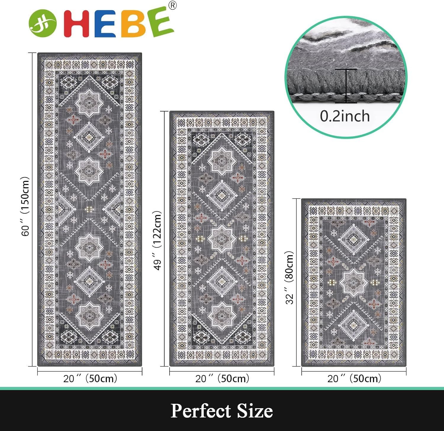 HEBE Vintage Kitchen Rug Set of 3 Pieces Non Slip Machine Washable Kitchen Rugs and Mats Set If you are looking for a super fashion, machine washable, anti skid rubber backing and durable kitchen floor mat set, this kitchen mats for floor 3 piece is your best choice! Product Description: This anti slip kitchen mat set is perfect for indoor and outdoor use, especially in kitchen sink, in front of door, doormat, entryway, living room, or bedroom.The package includes set of 3 mats rugs runner . It’s a perfect kitchen mats sets for kitchen, laundry room, entrance doormats rug,wash room floor mat,bathroom rug, indoor/outdoor door mats, bedroom, living room, dining room, porch, stairs, balcony, kids room or any other place you want. Soft & durable:This durable kitchen floor mats and rugs is no color fade and no pattern deform. The classic pattern of boho dds a warm element to home decor and brings more blessings to family and friends, they will very happpy if you gave them the kitchen rugs sets as a Christmas gift! Product Specification: Shape: Rectangle Style:Boho Kitchen floor mats set of 2 Size: 20"x32"+20"x48"+20"x59"; Package includes: 1 x kitchen floor mats with runner set of 3 Kitchen Rugs Sets 3 Piece with Runner: This farmhouse kitchen rugs set include 3 piece kitchen floor mat which measures 20"x32"+20"x47"+20"x59". Perfect combination size, you can arrange them at will in any home, office or christmas holiday decoration Durable Kitchen Mats for Floor: Our kitchen runner rug set made of premium polypropylene fabric material, very durable use.Classic printing with rich elements and dyeing process, non-fading and non-shrink, protect your kitchen floor dry and clean No Slip Kitchen Rug Set with Runner: The boho kitchen floor mat set come with premium non skid TPR and cotton backing, durable, reliable and practical, which make our kitchen runner set effective to avoid slipping and scratching,protecting your family Washable Kitchen Rug Runner Set: Our washable rug can be routinely cleaned with a regular vacuum cleaner or machine washable for a deep clean.The farmhouse area rugs for kitchen has been tested for many machine washes, will not fade, will not deform Widely Use Vintage Accent Rugs: The distressed hallway runner rug carpet is ideal for wash room floor mat, laundry room rug, kitchen rug carpet, indoor doormats, hallway runner rug, bathroom rug,also great gift Christmas,Thanksgiving and New Year