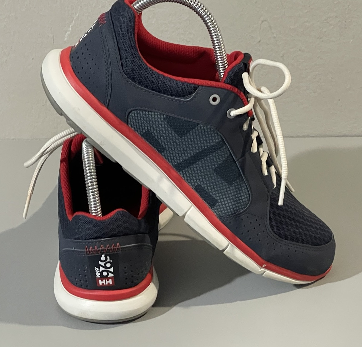 With scratches see pictures for imperfection, sold as is. The Helly Hansen Ahiga V4 Hydropower Sailing sneakers in blue are designed for men in size 8.5. These athletic shoes feature a tie closure and are suitable for activewear occasions. Made in Vietnam, these sneakers are part of the Helly Hansen product line, known for their performance in activities like gym training, CrossFit, and running. With a sleek sneaker style, they are ideal for summer, fall, and spring seasons, offering both comfort and functionality for various athletic pursuits.