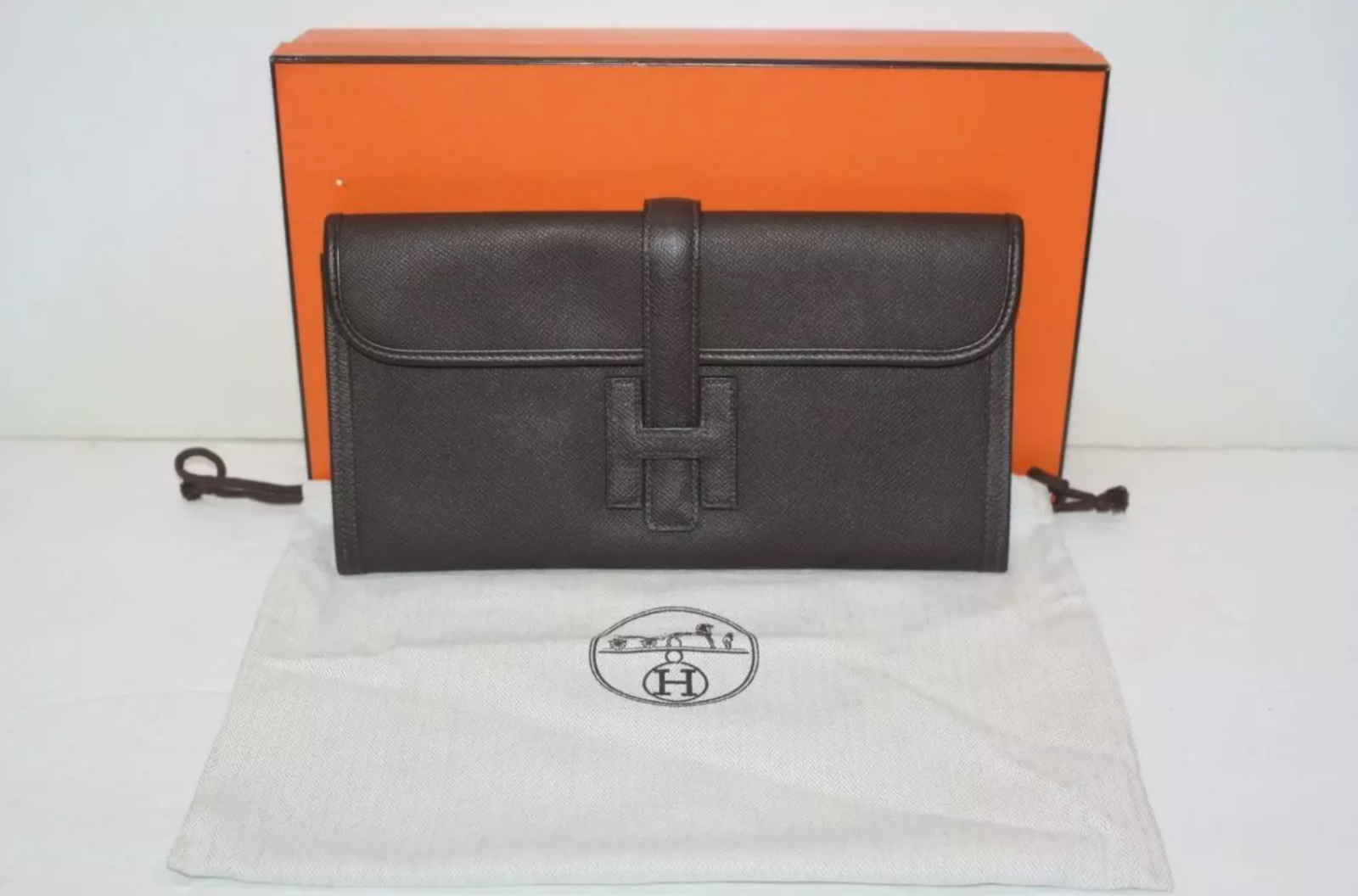 HERMES Dark Brown Epsom Leather Jige Elan 29 Clutch Bag Retail $3,725 Authentic **HAS A RED SECURITY TAG #1110522, IF TAG IS MISSING OR HAS BEEN TAMPERED WITH, RETURNS WILL NOT BE ACCEPTED** Designer: Hermes Material: Orange Epsom leather Includes: Hermes dust bag & box Origin: France Production Year: 2015 Date/Authenticity Code: T*018 AK Measurements: 11.5" L x 1" W x 5.75" H Closure/Opening: Flap top Interior Lining: Lambskin leather