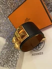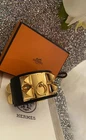 HERMES calfskin gold plated Medor pyramid studs and ring adjustable closure with receipt. Wrist size up to 8” | Width: 1.6" THE BRACELET COMES WITH HERMES BOX, POUCH AND RECEIPT. NOTE: THE COLLIER BANGLE WAS USED ONCE IN MINT CONDITION. PLEASE LET ME KNOW IF YOU HAVE ANY QUESTIONS. The story behind A customer’s flight of fancy sometimes result in a piece that becomes essential to the Hermès collections. In 1927, a daring customer looking for a belt to accessorize her outfits was especially drawn to our dog collar. The request inspired the house to create a belt decorated with four-faceted Médor studs and adorned with a ring. The purity of the belt’s lines and volumes eventually led to the creation of the iconic Collier de Chien bracelet. DO NOT FORGET TO CHECK OUT MY EBAY STORE FOR A GREAT DEALS!!!