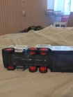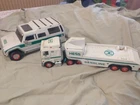 Hess SUV and Truck and flat bed trailer. Believe the Trailer came with a helicopter originally, not included here,just what you see. Tires missing on truck and trailer,not sure if this is original or if they were removed ( see photos).