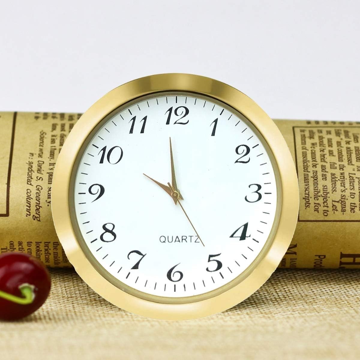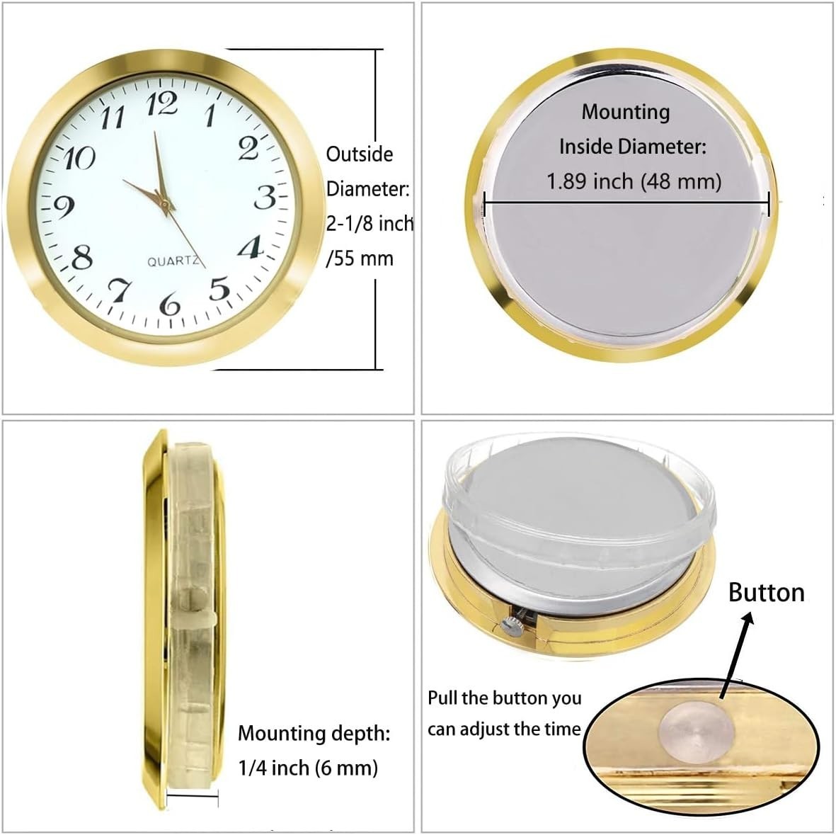 About this item ✔️ Overall Outside Diameter: 2-1/8 inch (55 mm).This is the outside diameter of the clock face. Mounting depth: 1/4 inch (6 mm). ✔️ Mounting Inside Diameter: 1.89” (48mm) : This is the insert diameter of the opening that the clock fits in. With addition of the ring gasket (included) this increases to 1.97" (50 mm). Quartz Movement Clock Insert with a ring gasket can securely hold the clock face in place. You can use this clock insert to make clock crafts. ✔️ Appearance: The insert clock features smooth surface and gold bezel with exquisite workmanship; It is designed with gold arabic numerals marking on the white dial plate for easy reading. ✔️ High quality: With stainless steel back and scratch resistant mineral glass lens, this mini clock is your good choice to make crafts or use it as a nice gift.Perfect for home, kitchen, office,etc. ✔️ Compatible clock: Miniature clock fitup Insert replacement fits in many types of small glass & crystal clocks quartz movement.
