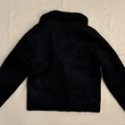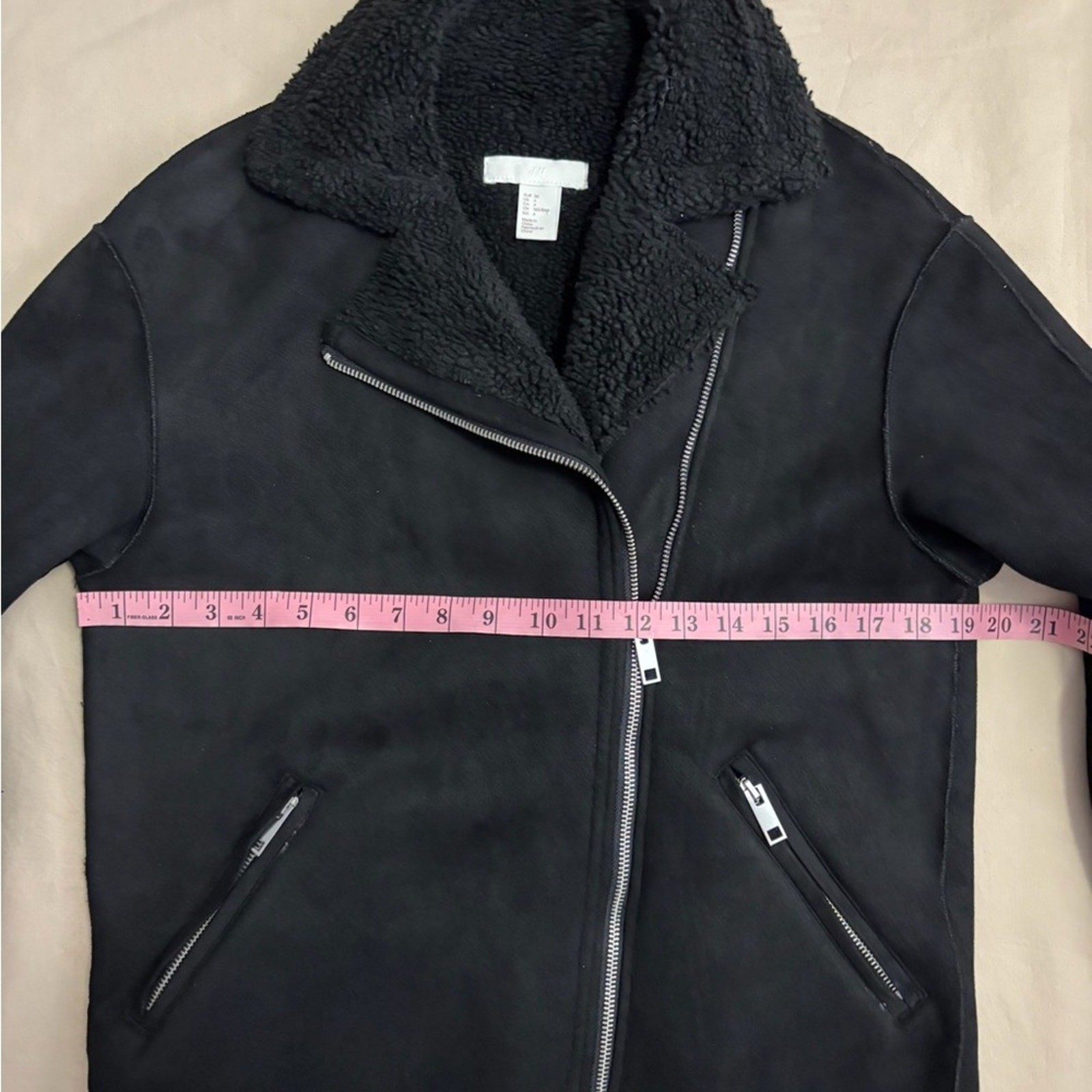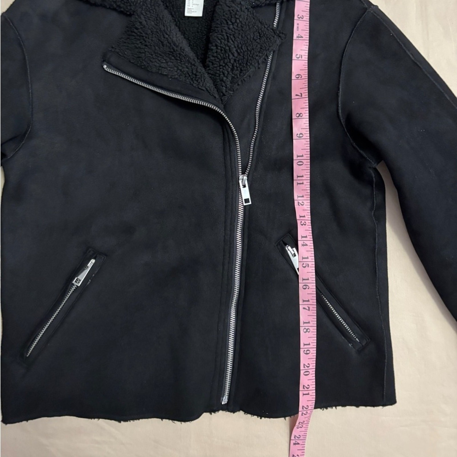 H&M Black Faux Suede Moto Style Jacket with Sherpa Lining Women’s Size 4 Used, excellent condition. Chic black faux suede motorcycle style jacket by H&M. Features cozy shearling texture. Ideal for cool weather. Approximate measurements shown in photos.