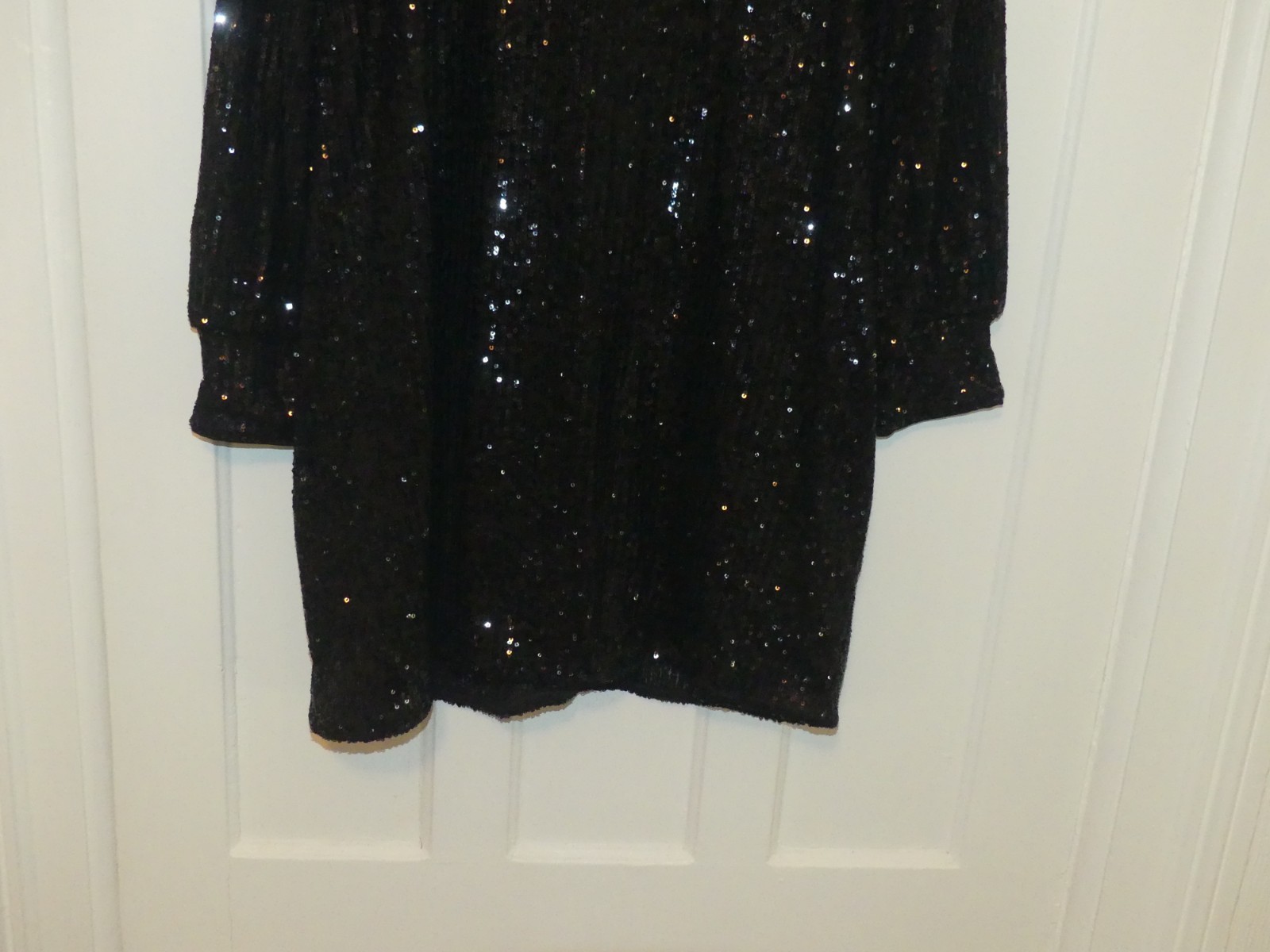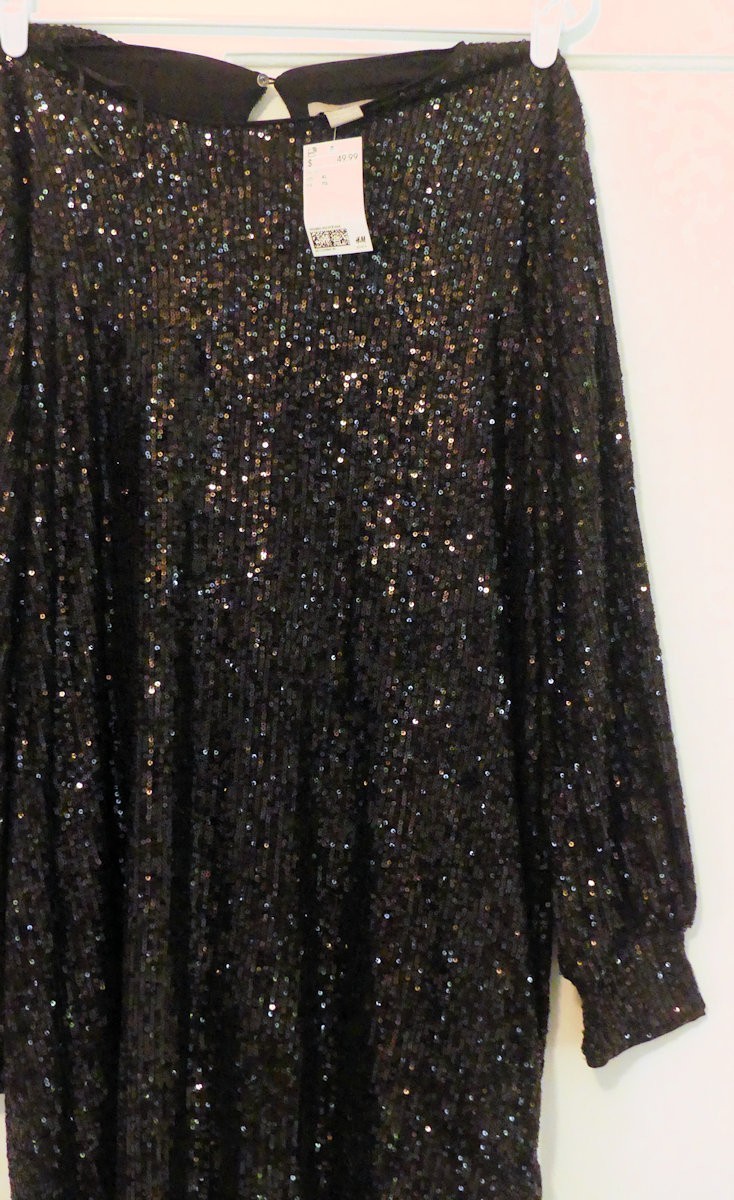 A brand-new H & M black, sequin cocktail dress. Worn once to try on then stored and never used. It is in perfect condition with no marks or tears, and no missing sequins that we can find. A rare chance to get one of these elegant cocktail frocks new. The dress is quite heavy due to the density of the sequins and the fabric used. Note that the sequins are all black and any colors you see are just reflections.