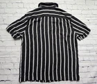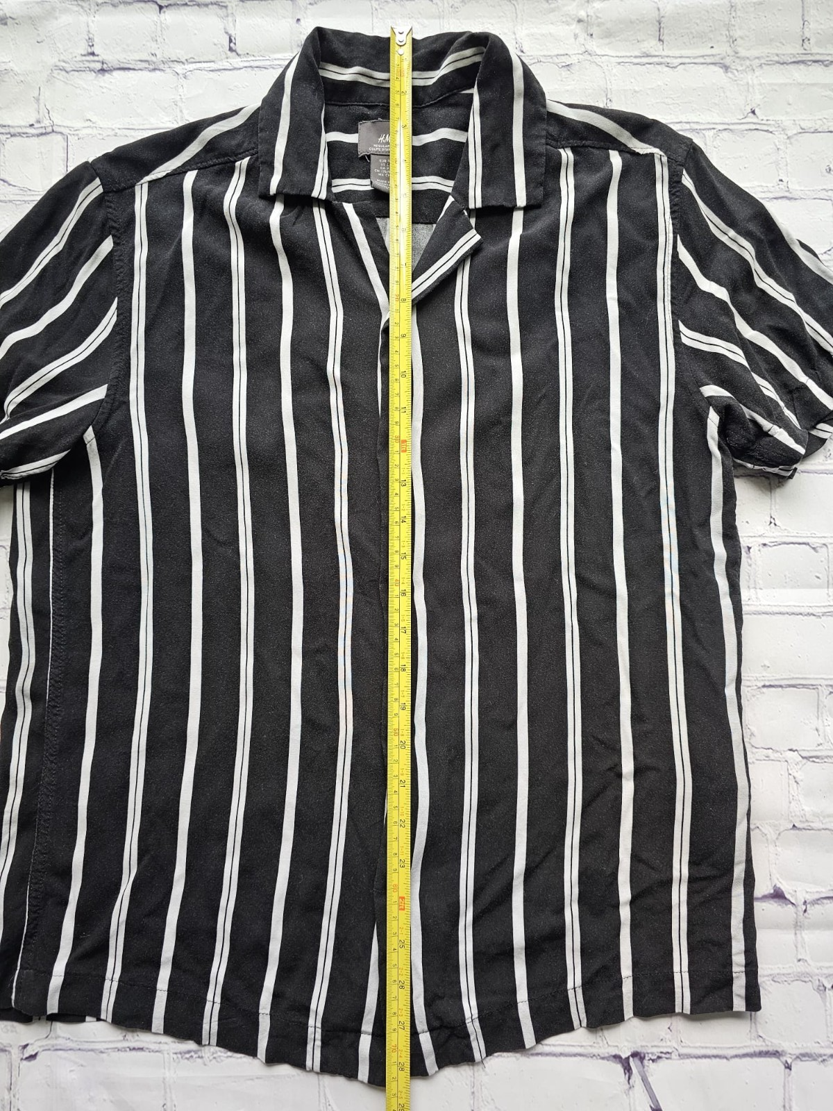 Description Pre-owned H&M short sleeve button-up shirt. Features a black base with vertical white stripes and a comfortable regular fit. Made of lightweight viscose fabric for a soft and breathable feel. Brand: H&M Size: Small (EUR S / US S / CA P / CN 175/92A / MX CH) Fit: Regular Fit Color: Black with white stripes Material: 100% Viscose Condition: Pre-owned. Note: Flaw on the back right sleeve seam (see photo). Otherwise in good wearable condition. Perfect casual shirt for summer or layering, still stylish despite the minor flaw.
