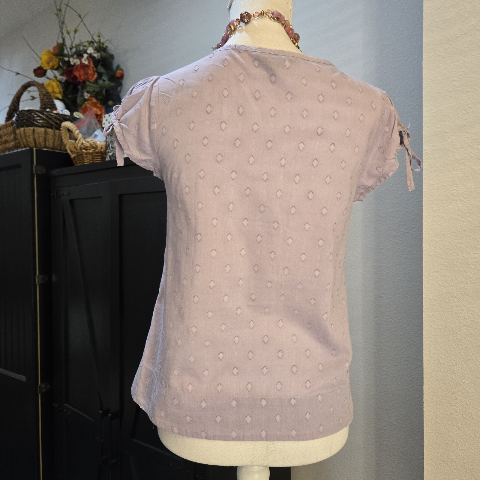 The H&M Blouse for women in Lavender Swiss Dot design is a lightweight top with a round neck, perfect for casual occasions. Made from 100% cotton, this shortsleeve blouse features a pintuck accent . The bohemian theme and regular fit make it a stylish and versatile addition to any woman's wardrobe. Made by H&M, this size 4 blouse is sure to become a favorite piece for everyday wear. jewlery not included. pit to pit 17" length 22"