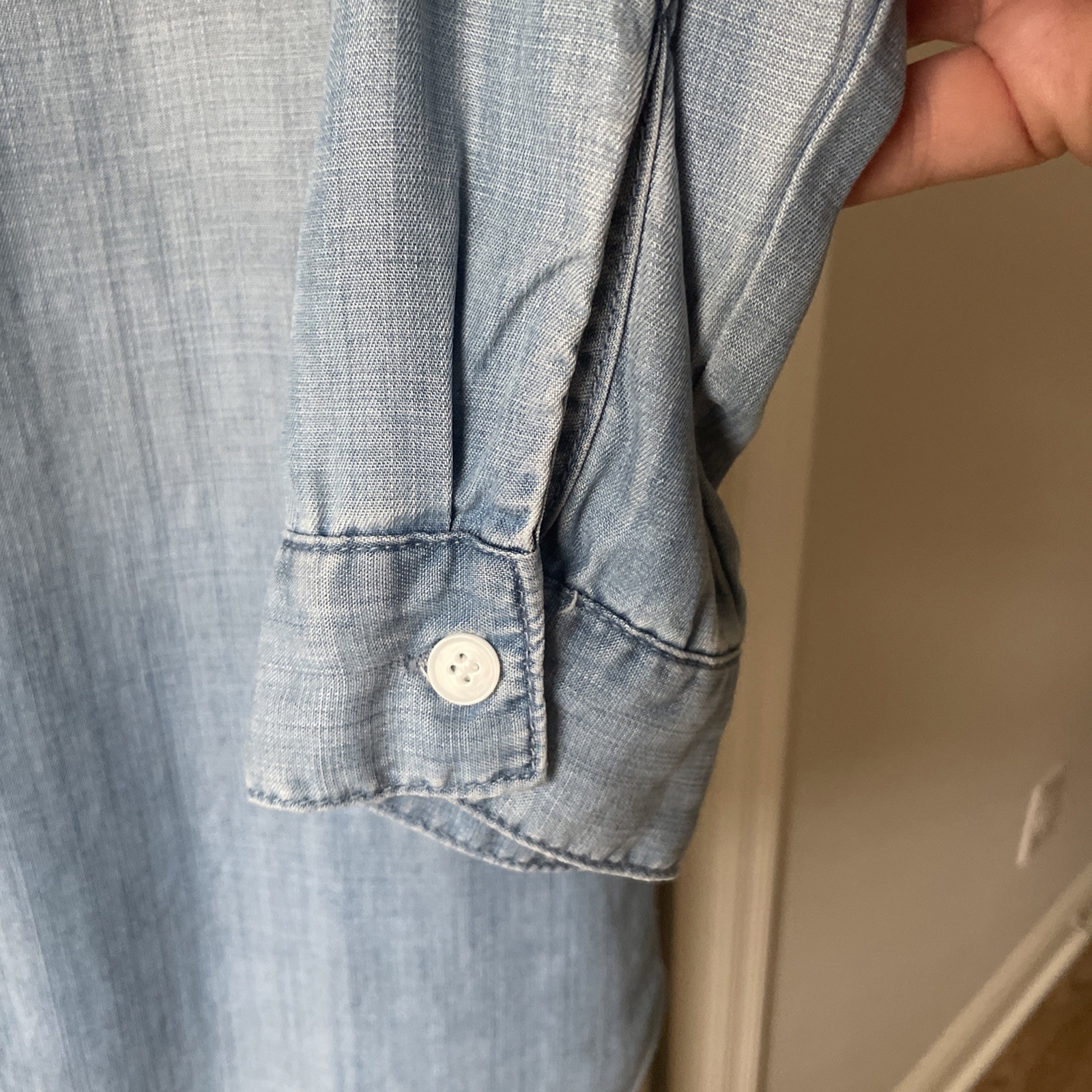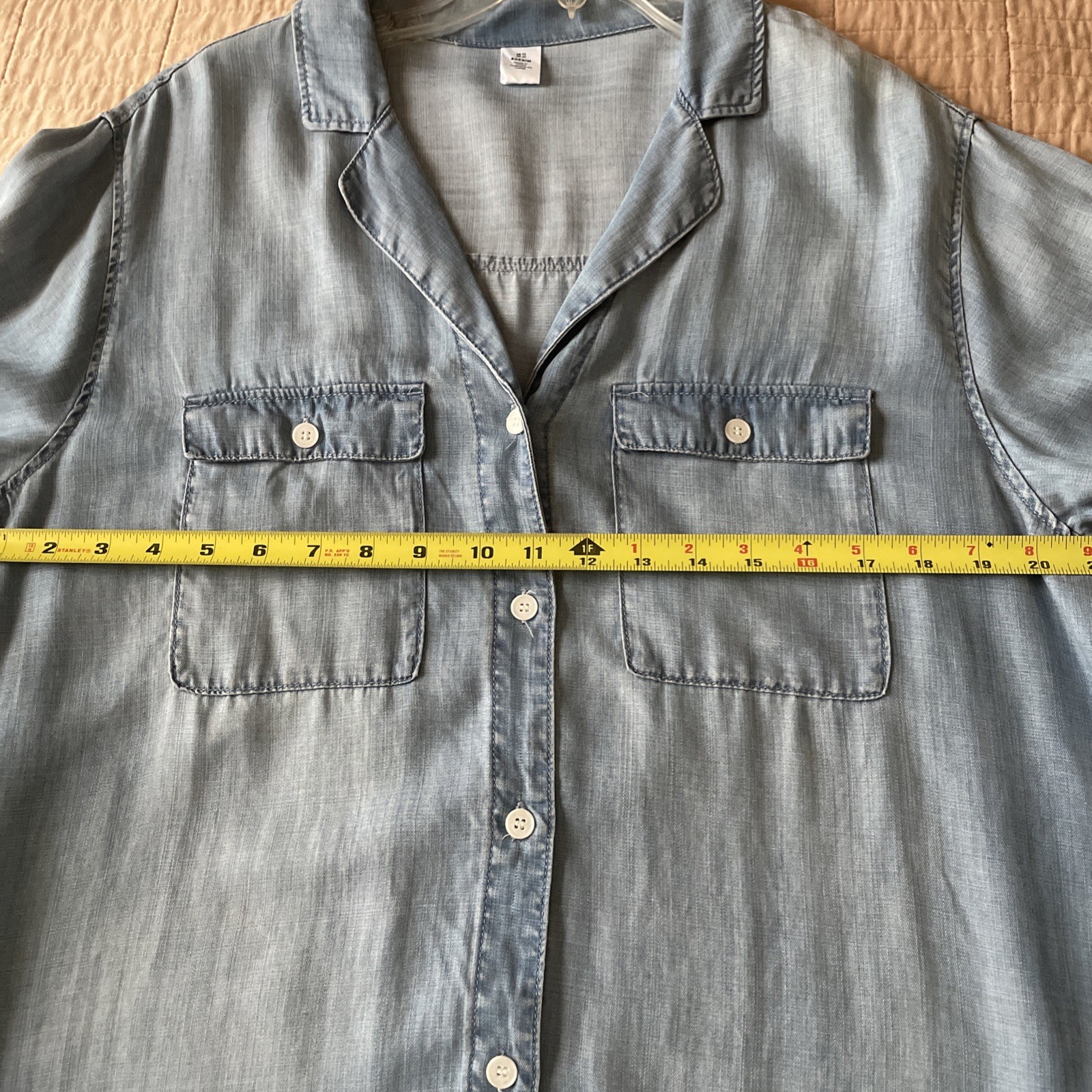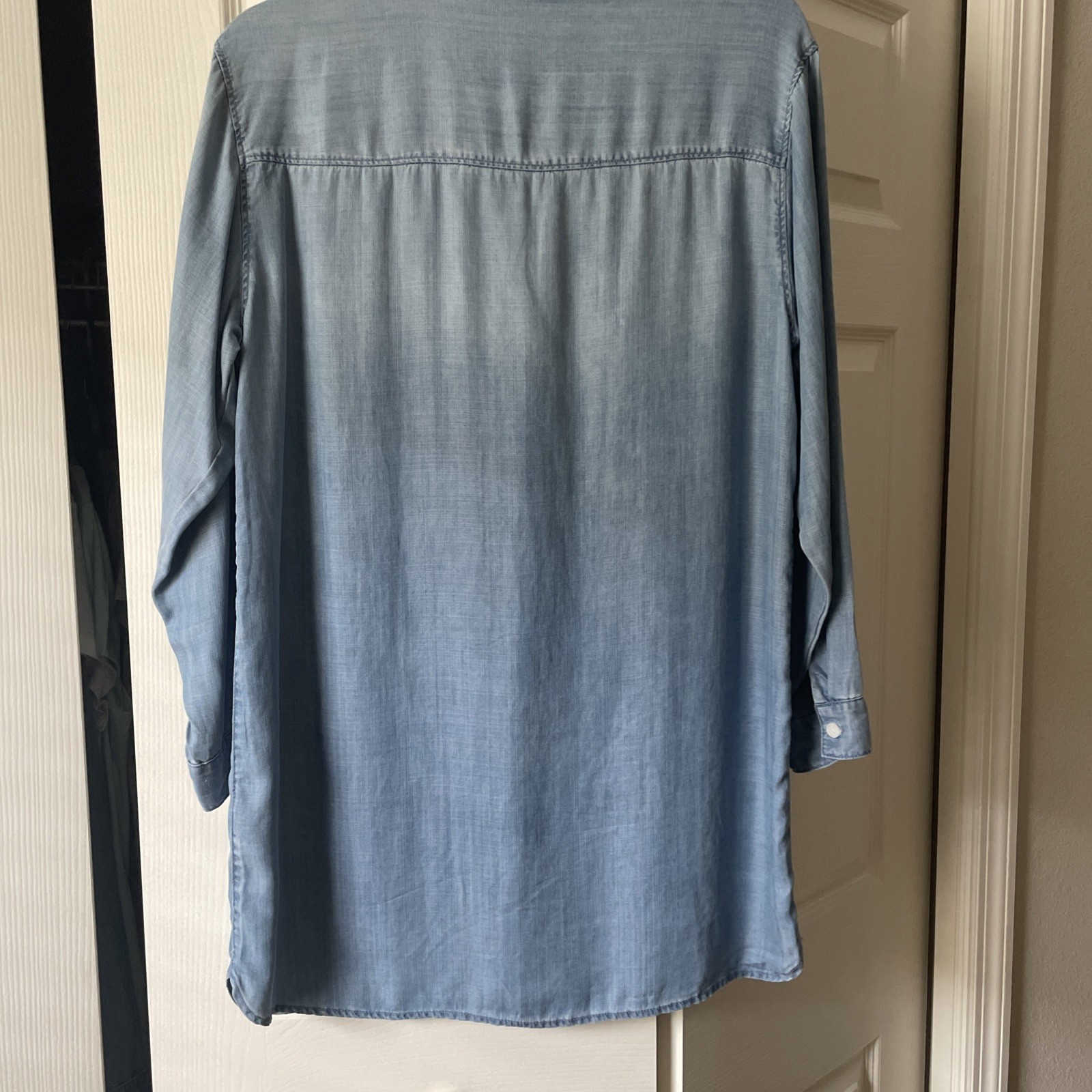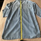 This H&M Denim Shirt for women in size 10 is an oversized, long sleeve top featuring a collared neckline and button closure. Made of 100% lyocell in denim light blue color, it is perfect for casual occasions with its relaxed fit. The shirt also includes breast pockets and a classic button-up style, making it a versatile and stylish addition to any wardrobe for all seasons. Excellent preowned condition, like new.