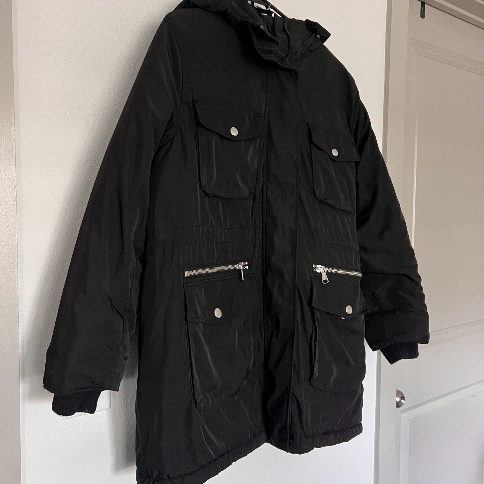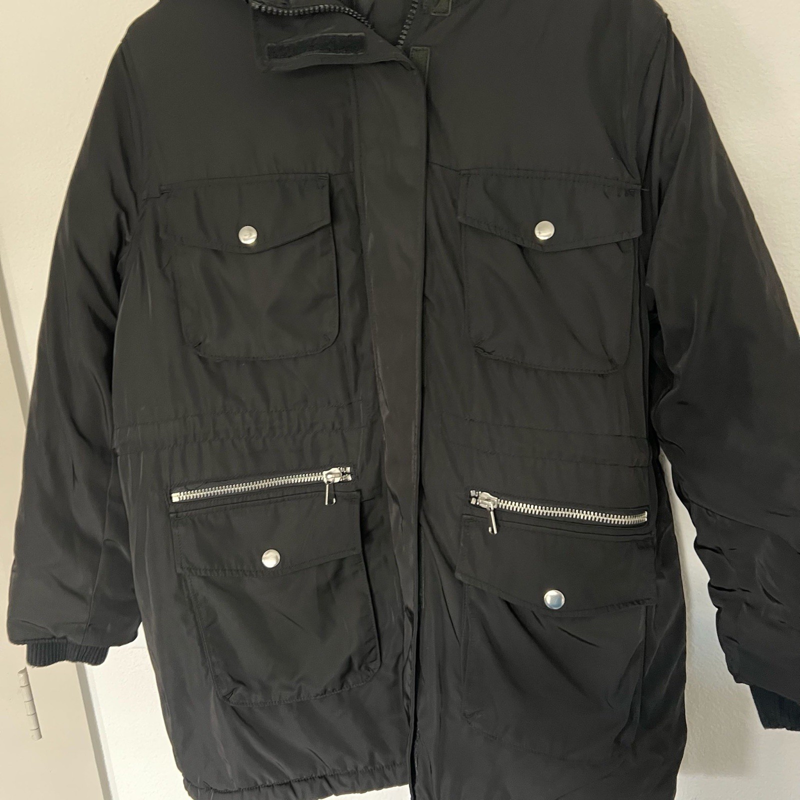 Stay warm and stylish with this H&M Divided black parka jacket, men’s size large. Features a quilted interior lining, multiple front pockets with zipper and snap details, and a removable hood. Made from 100% polyester for comfort and durability. Gently used and in excellent condition — perfect for cold weather or casual streetwear looks.