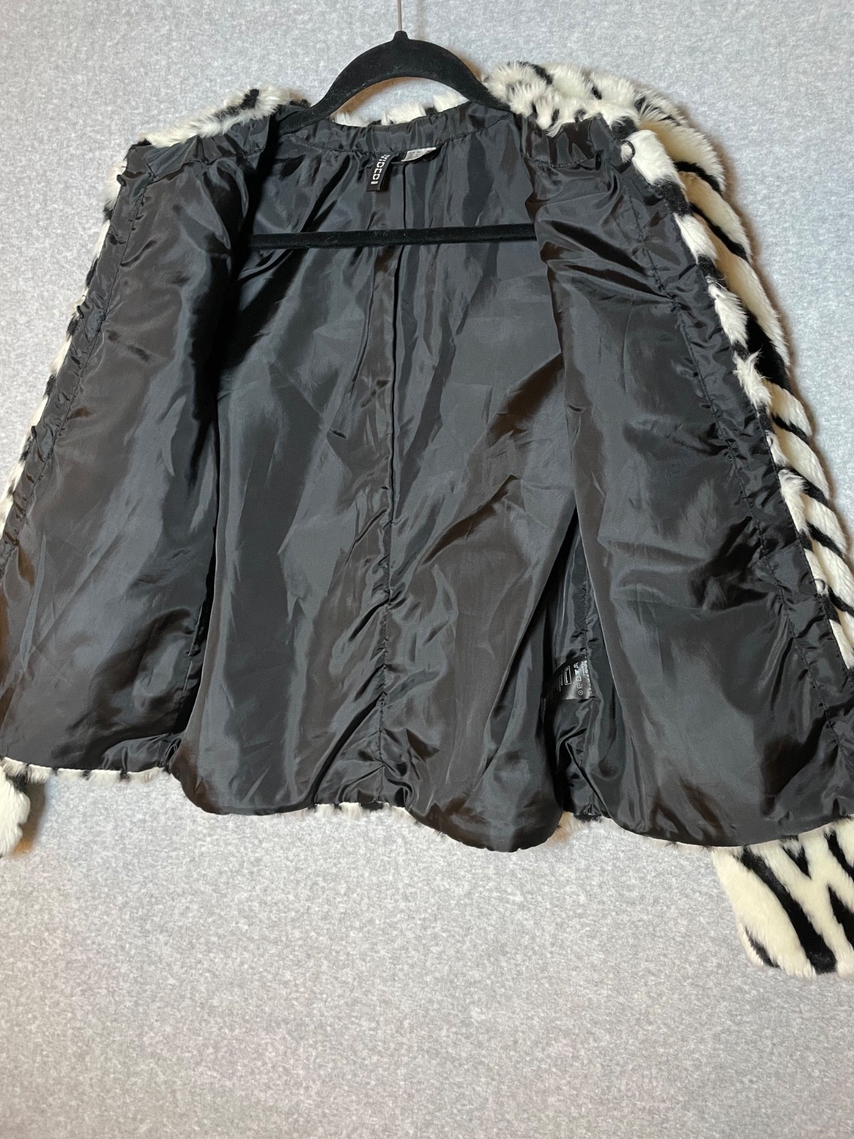 Measures approximately 16 inches from pit to pit, 23.5 inch sleeve length, 15 inches across the shoulders and 22 inches long. Comes from a pet friendly home, no stains tears or holes. Has a hook and loop closure. No pockets.