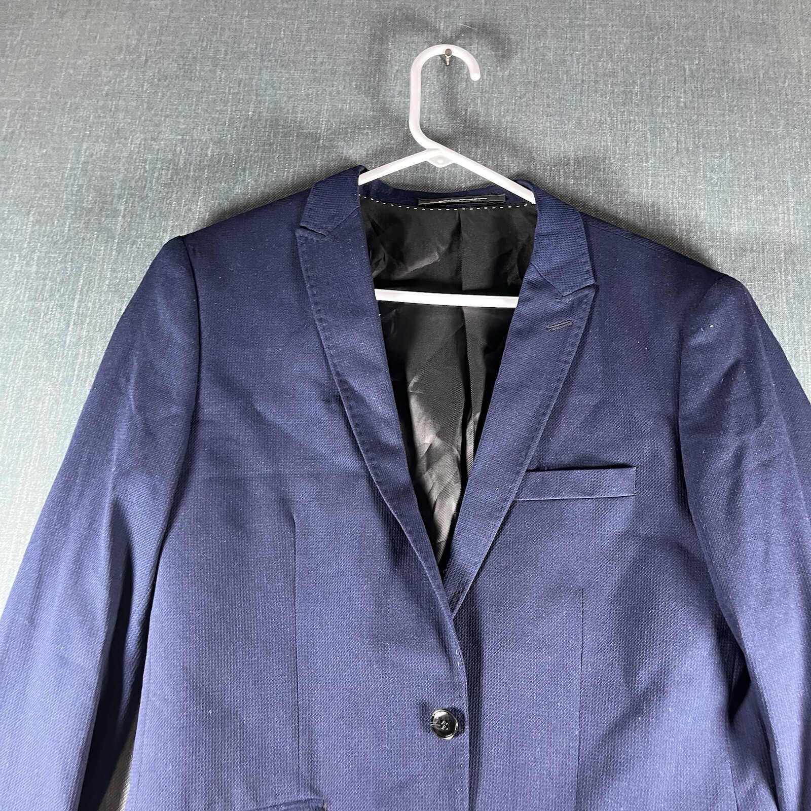 Will ship out within 2 Business days, 30 day Free returns. Send offers. HM Men Blazer Blue Long Sleeve Button Closure Skinny Fit Size 40 Polyester Blend. Good used condition, threads fraying on back, check photos.