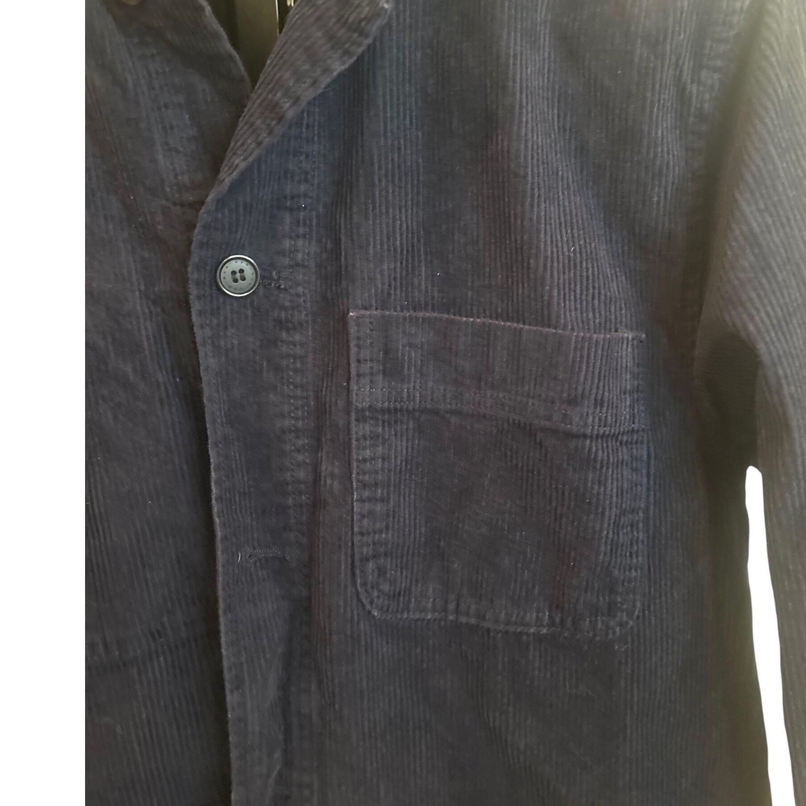 Navy blue corduroy chore jacket from H&M crafted from durable 100% cotton. This versatile overshirt features a classic point collar and a functional three-pocket design, including one chest patch pocket and two larger waist pockets. The button-front closure and buttoned cuffs provide a structured yet relaxed fit, making it an ideal layering piece for transitional weather. Its rich texture and deep navy hue offer a timeless workwear aesthetic that pairs easily with denim or chinos. Keywords: Chore Coat, Workwear, Corduroy, Overshirt, Navy Blue, Minimalist, Dark Academia, Rugged, Transitional, Layering, Utility, Casual, Classic, Cotton Jacket, Menswear Thank you for viewing. Please check out my other items to bundle and save!