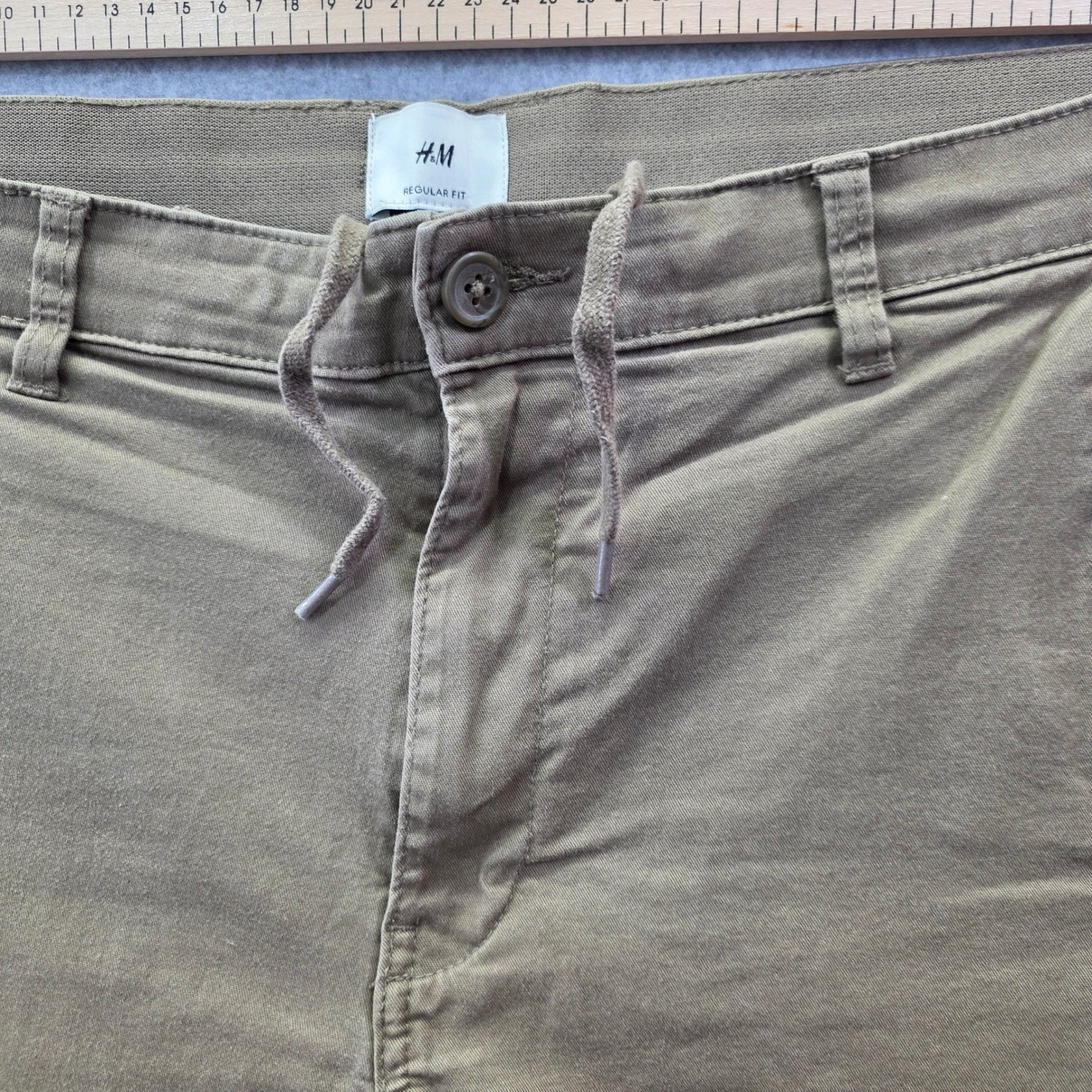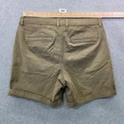 H&M Regular Fit chino shorts in a versatile olive green or khaki earth tone. These shorts feature a comfortable elasticized waistband with an adjustable drawstring and a classic button-and-zip fly. Designed with a clean-cut aesthetic, they include side slant pockets, rear welt pockets, and sewn-cuffed hems for a polished casual look. The cotton-blend fabric provides a slight stretch for all-day comfort. Measurements: • Waist: 17.5" (35" doubled) • Inseam: 7" • Leg Opening: 10.5" • Rise: 11"