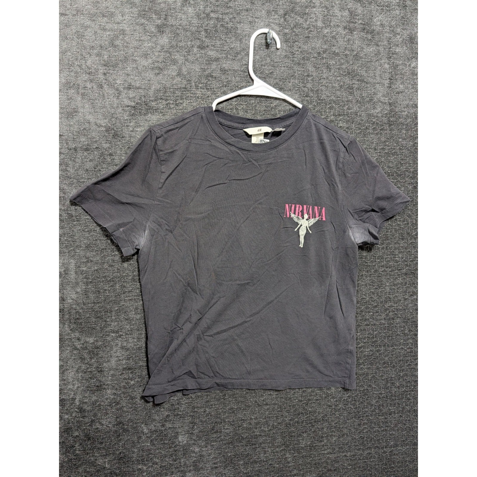 Nirvana graphic t-shirt from H&M features the iconic In Utero angel logo on the front chest in pink and white, with a comprehensive 1993-1994 world tour date list printed across the back. Crafted from a soft charcoal grey cotton jersey, this short-sleeve tee has a classic crew neck and a slightly faded, vintage-inspired aesthetic. Please note visible discoloration/fading under the armpits as shown in the photos. Measurements: • Pit to Pit: 18" (36" chest) • Length: 19"