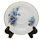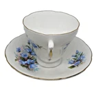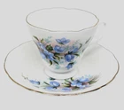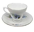HM Royal Sotherland Bone China Tea Cup & Saucer Blue Flowers Gilt Trim Vintage HM Royal Sotherland in England. The set is made of bone china and features a blue floral pattern with gilt trim. The footed teacup has a handle and is decorated with the same floral pattern. The saucer is also included in the set. This original set is a Victorian style and can be used for all occasions. All occasion Gift. Collectible.