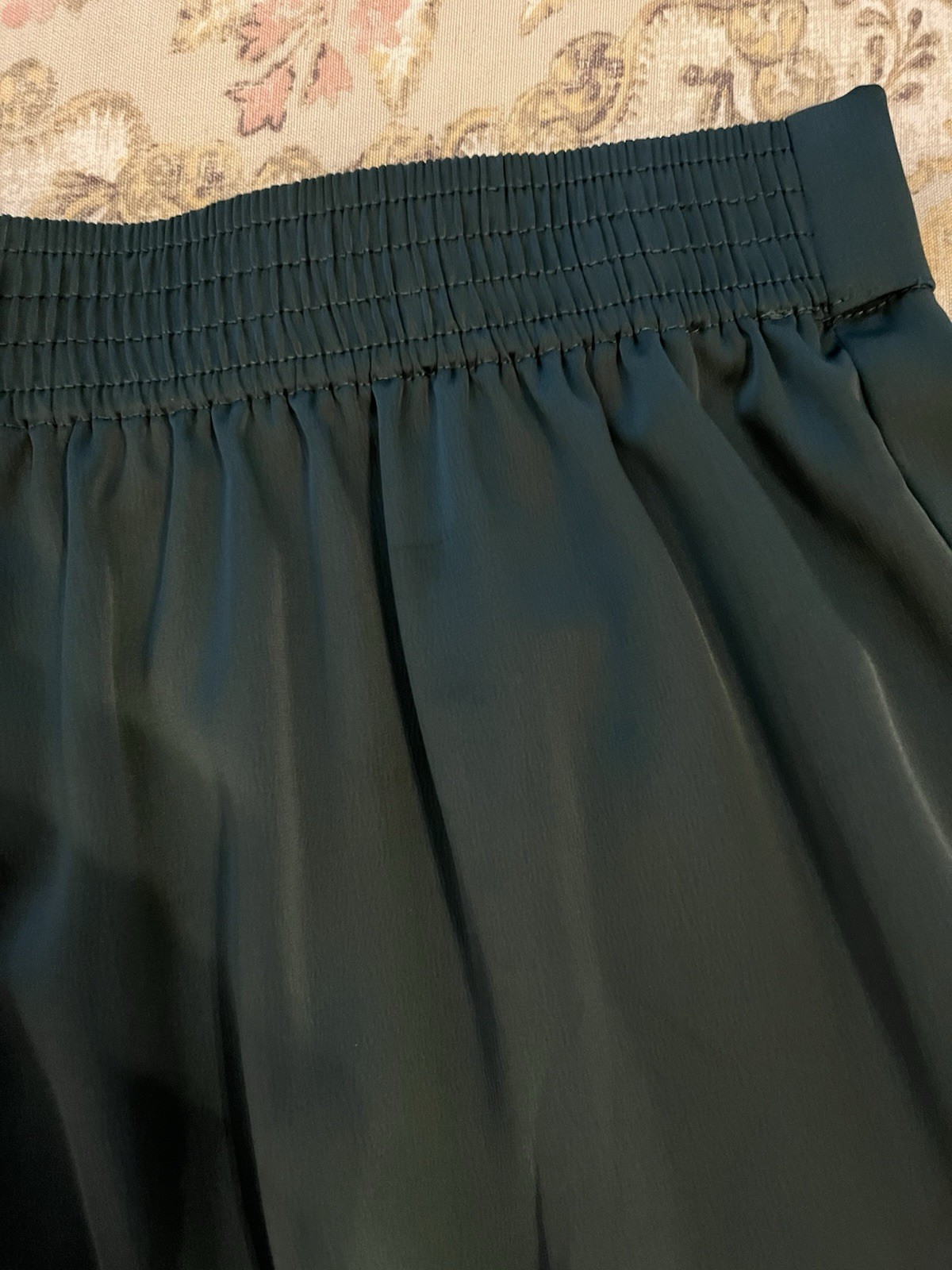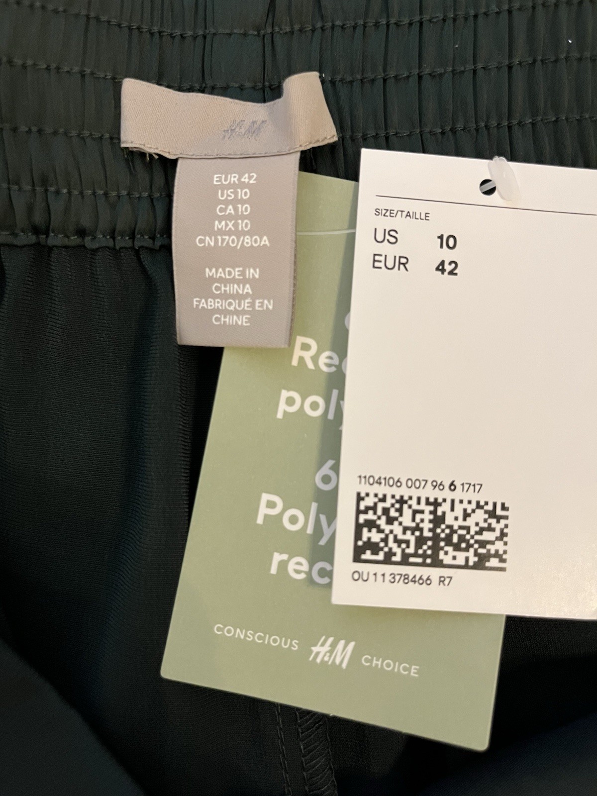 These H&M Satin Wide Leg Trousers in emerald green are a stylish and comfortable addition to any woman's wardrobe. The pull-on closure and relaxed fit make them easy to wear for various occasions such as travel, parties, or formal events. Made from lightweight and comfortable polyester satin material, these pants are machine washable and featuring an elastic waist for added convenience. With a solid color and wide-leg design, these trousers are perfect for the winter, fall, or spring seasons, adding a touch of holiday or city-inspired flair to any outfit.