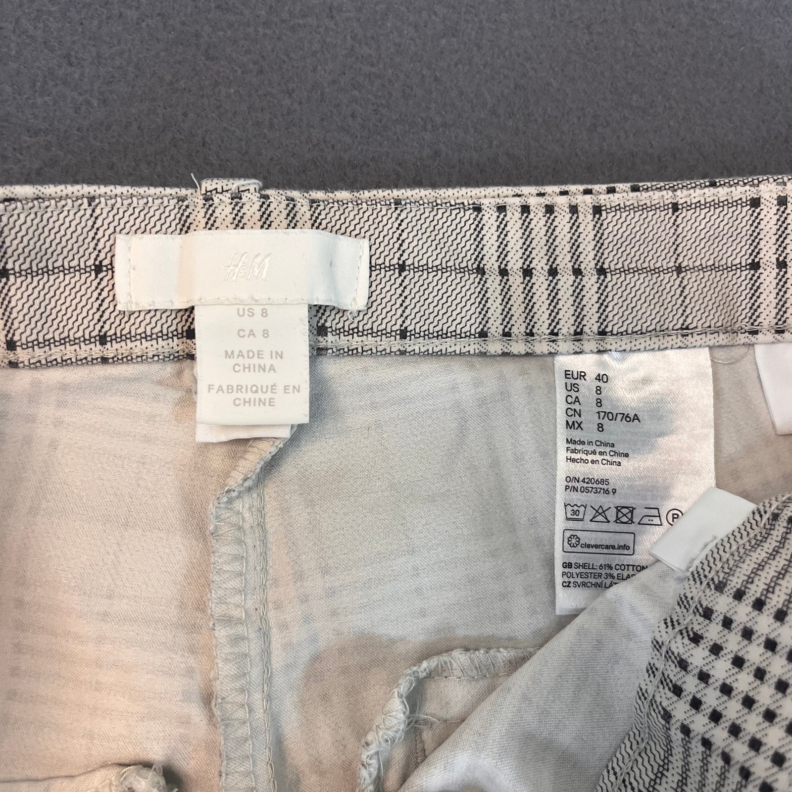 The H&M Stretch Woven Plaid Check Slacks in women's size 8 are a stylish and versatile addition to any wardrobe. Featuring a classic plaid pattern in gray and black, these mid-rise pants have a comfortable stretch fit for a flattering and comfortable feel. With a zip, hook & eye closure and straight leg style, these dress pants are perfect for formal events, workwear, or a dressy casual look. Easy to care for with machine washable instructions, these pants are suitable for all seasons and are sure to elevate any outfit with their preppy charm.
