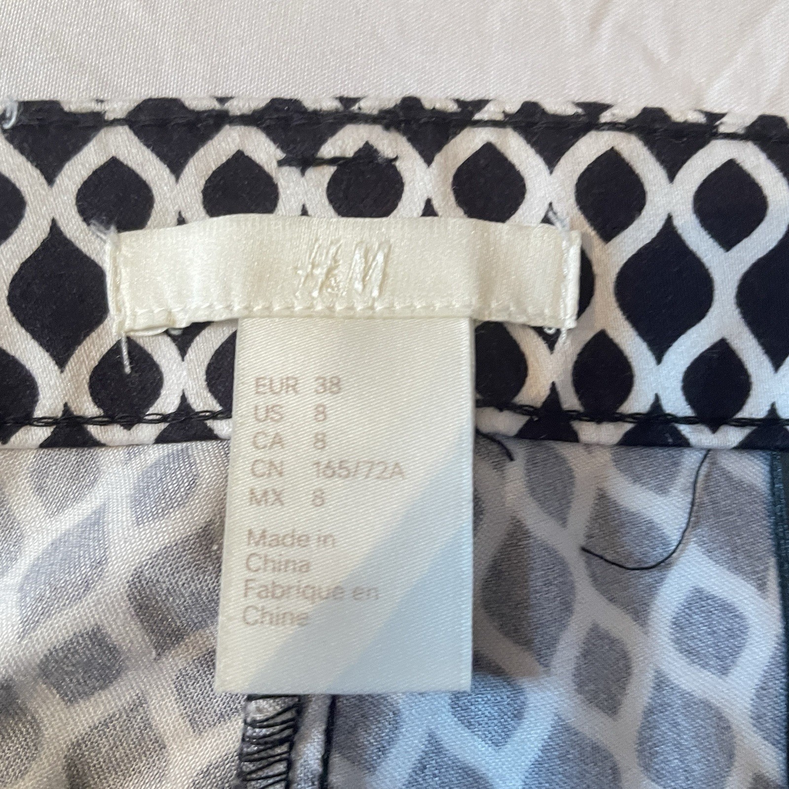 Polished ankle-length trousers feature a striking black and white geometric lattice print throughout. Crafted from a comfortable stretch cotton blend, these slim-fit pants are designed with a clean waistband, belt loops, and a subtle side zip closure for a streamlined silhouette. The mid-rise cut and tapered leg make them a versatile choice for professional wear or elevated casual styling. Measurements: • Waist: 14.5" (29" doubled) • Rise: 9.5" • Inseam: 28" • Leg Opening: 6" Brand: H&M Style: Slim Fit Ankle Pants Pattern: Geometric / Lattice Color: Black, White Material: 65% Cotton, 33% Polyester, 2% Elastane Closure: Side Zip Features: Stretch, Belt Loops Occasion: Business Casual, Office, Career Fit: Slim Leg Style: Tapered / Ankle Keywords: Mod, Retro, Optical Print, Workwear, Professional, Chic, Minimalist, Monochrome, Preppy, Dark Academia, Careerwear, Stretch Trousers, Geometric Print