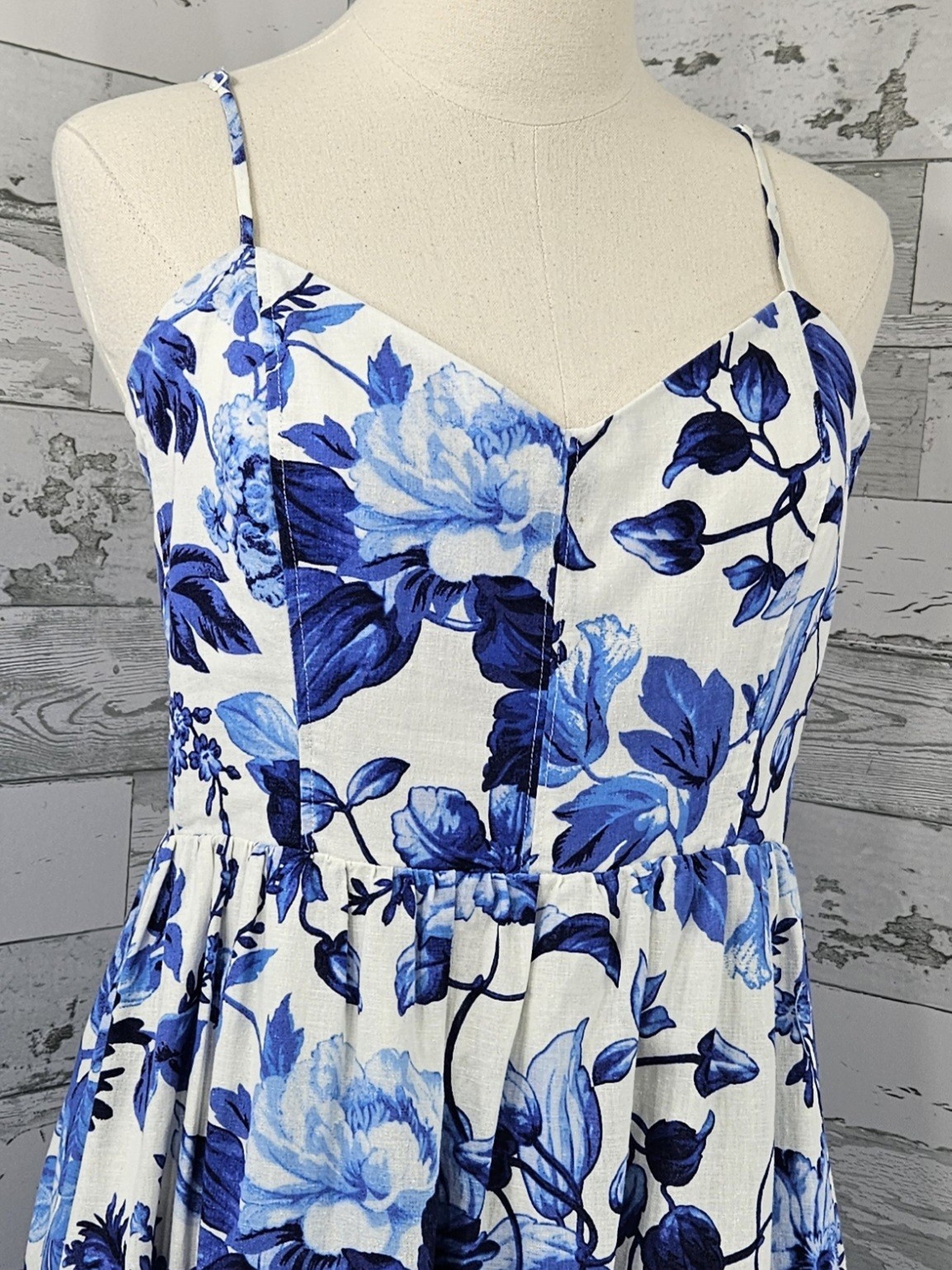HM Womens Medium Blue Floral Linen Blend Midi Dress Sweetheart Neckline Strappy