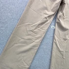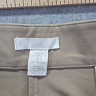 Wide leg dress pants in a versatile tan beige hue offer a polished silhouette for professional or smart-casual wear. These trousers feature a clean-front design with a concealed closure, slant side pockets, and back darts for a tailored fit. The mid-weight fabric has a subtle diagonal twill texture that provides a structured yet comfortable drape. Measurements: • Waist: 14" (28" doubled) • Inseam: 31" • Rise: 11" • Leg Opening: 10" (20" doubled)