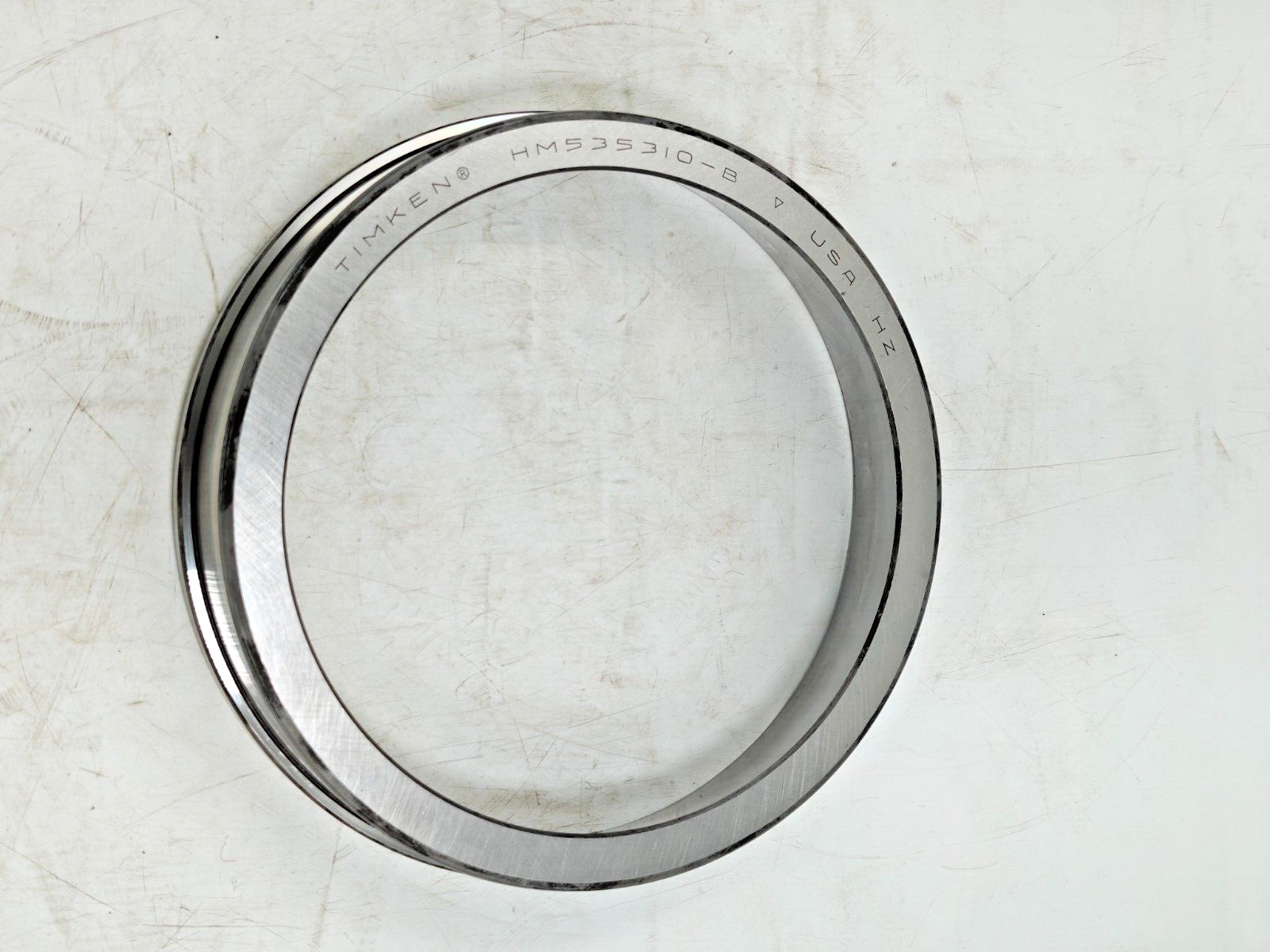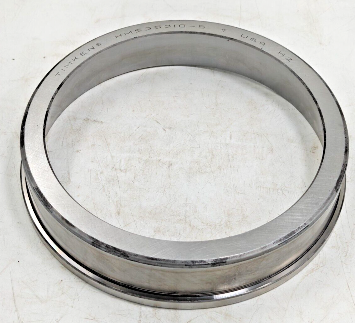 HM535310B Timken Tapered Roller Bearing CUP, Flanged 10.2500" OD HM 535310-B USA Like the TS bearing design, the TSF design consists of two main separable parts: the cone (inner ring) assembly and the cup (outer ring). It is typically mounted in opposing pairs on a shaft. TSF bearings have flanged cups to facilitate axial location and accurately align seals in through-bored housings. Unit of Measure Imperial Metric Both Specifications | Dimensions | Abutment and Fillet Dimensions | Factors Specifications Series HM535300 Cup Part Number HM535310-B Design Units Imperial Dimensions D - Cup Outer Diameter 10-1/4 in 260.350 mm D1 - Flange Outer Diameter 10.6840 in 271.374 mm C - Cup Width 2.0625 in 52.388 mm C1 - Cup Flange Width 0.4375 in 11.113 mm Abutment and Fillet Dimensions r - Cup Backface "To Clear" Radius 1 0.130 in 3.30 mm Da - Cup Frontface Backing Diameter 9.86 in 249.94 mm Factors K - Factor 2 1.45 e - ISO Factor 3 0.4 Y - ISO Factor 4 1.49 G1 - Heat Generation Factor (Roller-Raceway) 867 G2 - Heat Generation Factor (Rib-Roller End) 225 Cg - Geometry Factor 5 0.124 1 These maximum fillet radii will be cleared by the bearing corners. 2 These factors apply for both inch and metric calculations. Consult your Timken representative for instruction on use. 3 These factors apply for both inch and metric calculations. Consult your Timken representative for instruction on use. 4 These factors apply for both inch and metric calculations. Consult your Timken representative for instruction on use. 5 Geometry constant for Lubrication Life Adjustment Factor a3l.