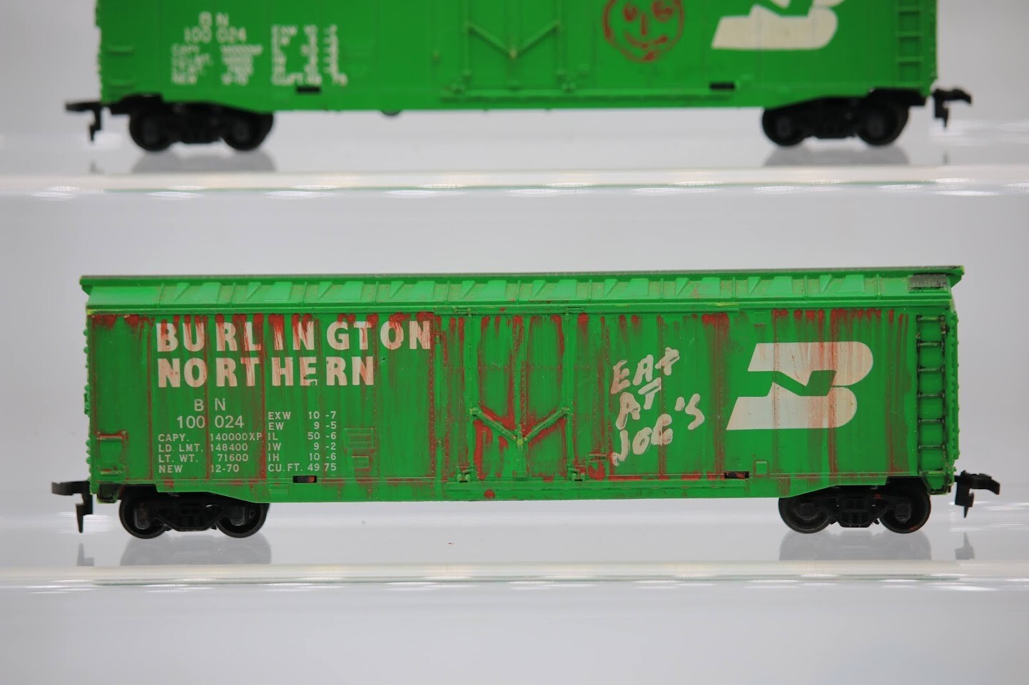 Ho Scale Custom Weathered and Graffiti Burlington Northern 10024 Lot of 2 SKU#004616 Look closely at the pictures to see further details. We ships USPS PLEASE see photos for detailed condition!! PLEASE LOOK AT THE PHOTOS CAREFULLY BEFORE PURCHASING!! If you are purchasing more than one item from us and would like combined shipping, PLEASE request an adjusted invoice from us while still in the cart and BEFORE paying. eBay does not usually calculate combined shipping accurately and you might get overcharged. Please be aware that when we photograph items, we use lighting that will show the details well. Although we try to present the product as accurately as possible, the lighting may affect the overall look of the item by appearing lighter/darker or possibly a different hue than the actual item. Depending on the type of lighting you have in your home, there may be some differences between the photos and the actual item. If this is a concern of yours, please feel free to request additional photos made in natural lighting or ask for a more detailed description of the item PRIOR TO PURCHASE! PLEASE NOTE: We greatly appreciate your interest in our item for sale. We look forward to a pleasant, quick and satisfying transaction for everybody, so please note the following information before bidding. Thank you! ITEM DESCRIPTIONS: * We will try to describe items well and provide plenty of photos. Please review these carefully before bidding or purchasing. * Only the items pictured and described are what you will receive when purchased. * We will occasionally offer an item clearly marked "AS-IS". This means that we are not sure if it works because we are unable to test it for whatever reason. We will offer these at a discounted price then a similar "working" item. It is possible that these items will work fine, but it also is possible that these items are more useful for their parts. Please only bid on or purchase these items if you are well aware of this, as we will only provide refunds of actual item price (no shipping cost refunds) for these items. * If you have any questions that aren't addressed by the descriptions or photos, please feel free to ask before you bid. * There may be pieces that are missing or broken including, but not limited to, couplers, brake wheels, steps, ladders, railings, minor rust spots or cracks, etc. May need detailed cleaning SHIPPING: * We usually do not offer shipping to international addresses, but ARE WILLING TO TAKE CONSIDERATIONS. * We try to pack items as carefully as possible, but damage may occur during shipping. If you receive an item that was damaged in shipping, please contact us and we will work with you to resolve the problem. * We will combine shipping costs for all items the same buyer purchases from us within 2 days. Please wait to pay for items until you're done shopping with us. Please contact us if you're expecting to buy more items from us, or to have us adjust the shipping costs. * We will usually ship items out within 24 hours of payment being received Sunday through Friday at noon. We will notify the buyer if there will be a delay in shipping for some reason. Please allow additional time for holidays and weekends when the post office is closed. If payment is received after noon (EST) on Friday, the item might not be shipped until the following Monday. * We do try to recycle shipping materials as much as possible. RETURNS: We abide by eBay's Money Back Guarantee. We definitely want our customers to be happy with their purchase! You may return an item within 30 days of receiving it with the following guidelines: * If the item is defective or damaged (unless we clearly marked the listing "AS-IS"), the buyer will receive a full refund after the buyer returns it and it is received by us. Customers who falsely claim their item is defective, damaged, or not as described in order to receive a full refund and free return shipping will be permanently blocked from making future purchases from us. * If the item is as described (including "AS-IS" items) and the buyer decides for any other reason than defective/damaged to return it, only the actual price of the item will be refunded once it has been returned and it is received by us. The buyer will be asked to pay all original and return shipping charges. This includes all reasons other than defective/damaged, including wrong size, wrong type, changed mind, etc. All "AS-IS" items will fall into this category of return. Please make sure the item is what you want before purchasing it. * Please contact us before initiating a refund request. FEEDBACK: We always leave feedback at the end of transaction. We consider the transaction to be over when we receive feedback from the buyer confirming the item arrived satisfactorily. If you are unsatisfied with your purchase please contact us before leaving neutral or negative feedback. WE APPRECIATE POSITIVE FEEDBACK IF YOU ARE SATISFIED WITH YOUR PURCHASE! THANK YOU FOR YOUR INTEREST IN THIS ITEM!
