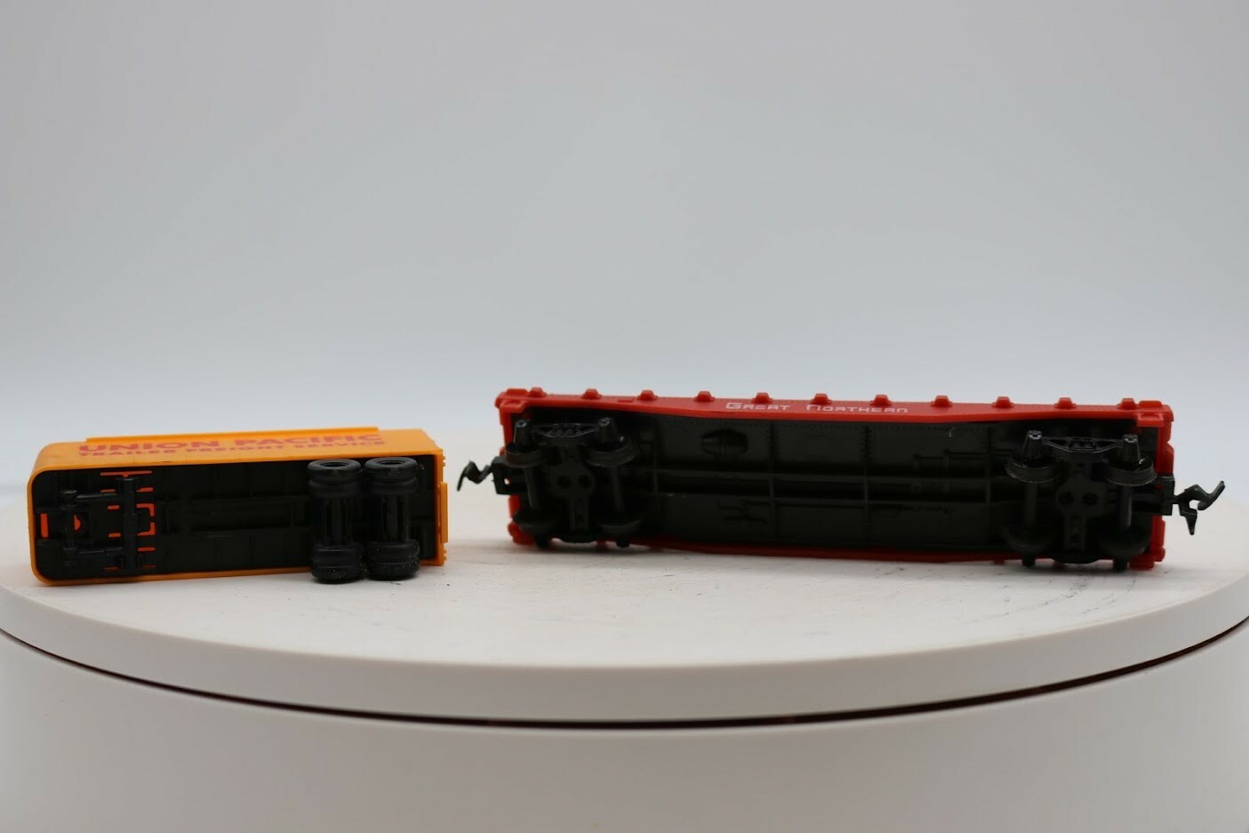 Ho Scale Great Northern Flat Car w/ TYCO Union Pacific Tractor Trailer. We ships USPS PLEASE see photos for detailed condition!! There may be pieces that are missing or broken including, but not limited to, couplers, brake wheels, steps, ladders, railings, etc. May need detailed cleaning. PLEASE LOOK AT THE PHOTOS CAREFULLY BEFORE PURCHASING!! If you are purchasing more than one item from us and would like combined shipping, PLEASE request an adjusted invoice from us while still in the cart and BEFORE paying. Ebay does not usually calculate combined shipping accurately and you might get overcharged. Please be aware that when we photograph items, we use lighting that will show the details well. Although we try to present the product as accurately as possible, the lighting may affect the overall look of the item by appearing lighter/darker or possibly a different hue than the actual item. Depending on the type of lighting you have in your home, there may be some differences between the photos and the actual item. If this is a concern of yours, please feel free to request additional photos made in natural lighting or ask for a more detailed description of the item PRIOR TO PURCHASE! PLEASE NOTE: We greatly appreciate your interest in our item for sale. We look forward to a pleasant, quick and satisfying transaction for everybody, so please note the following information before bidding. Thank you! ITEM DESCRIPTIONS: * We will try to describe items well and provide plenty of photos. Please review these carefully before bidding or purchasing. * Only the items pictured and described are what you will receive when purchased. * We will occasionally offer an item clearly marked "AS-IS". This means that we are not sure if it works because we are unable to test it for whatever reason. We will offer these at a discounted price then a similar "working" item. It is possible that these items will work fine, but it also is possible that these items are more useful for their parts. Please only bid on or purchase these items if you are well aware of this, as we will only provide refunds of actual item price (no shipping cost refunds) for these items. * If you have any questions that aren't addressed by the descriptions or photos, please feel free to ask before you bid. SHIPPING: * We offer international shipping, if you have any questions please reach out. * We try to pack items as carefully as possible, but damage may occur during shipping. If you receive an item that was damaged in shipping, please contact us and we will work with you to resolve the problem. * We will combine shipping costs for all items the same buyer purchases from us within 2 days. Please wait to pay for items until you're done shopping with us. Please contact us if you're expecting to buy more items from us, or to have us adjust the shipping costs. * We will usually ship items out within 24 hours of payment being received Sunday through Friday at noon. We will notify the buyer if there will be a delay in shipping for some reason. Please allow additional time for holidays and weekends when the post office is closed. If payment is received after noon (EST) on Friday, the item might not be shipped until the following Monday. * We do try to recycle shipping materials as much as possible. RETURNS: We abide by eBay's Money Back Guarantee. We definitely want our customers to be happy with their purchase! You may return an item within 30 days of receiving it with the following guidelines: * If the item is defective or damaged (unless we clearly marked the listing "AS-IS"), the buyer will receive a full refund after the buyer returns it and it is received by us. Customers who falsely claim their item is defective, damaged, or not as described in order to receive a full refund and free return shipping will be permanently blocked from making future purchases from us. * If the item is as described (including "AS-IS" items) and the buyer decides for any other reason than defective/damaged to return it, only the actual price of the item will be refunded once it has been returned and it is received by us. The buyer will be asked to pay all original and return shipping charges. This includes all reasons other than defective/damaged, including wrong size, wrong type, changed mind, etc. All "AS-IS" items will fall into this category of return. Please make sure the item is what you want before purchasing it. * Please contact us before initiating a refund request. FEEDBACK: We always leave feedback at the end of transaction. We consider the transaction to be over when we receive feedback from the buyer confirming the item arrived satisfactorily. If you are unsatisfied with your purchase please contact us before leaving neutral or negative feedback. WE APPRECIATE POSITIVE FEEDBACK IF YOU ARE SATISFIED WITH YOUR PURCHASE! THANK YOU FOR YOUR INTEREST IN THIS ITEM!
