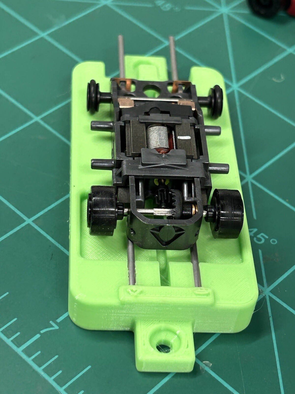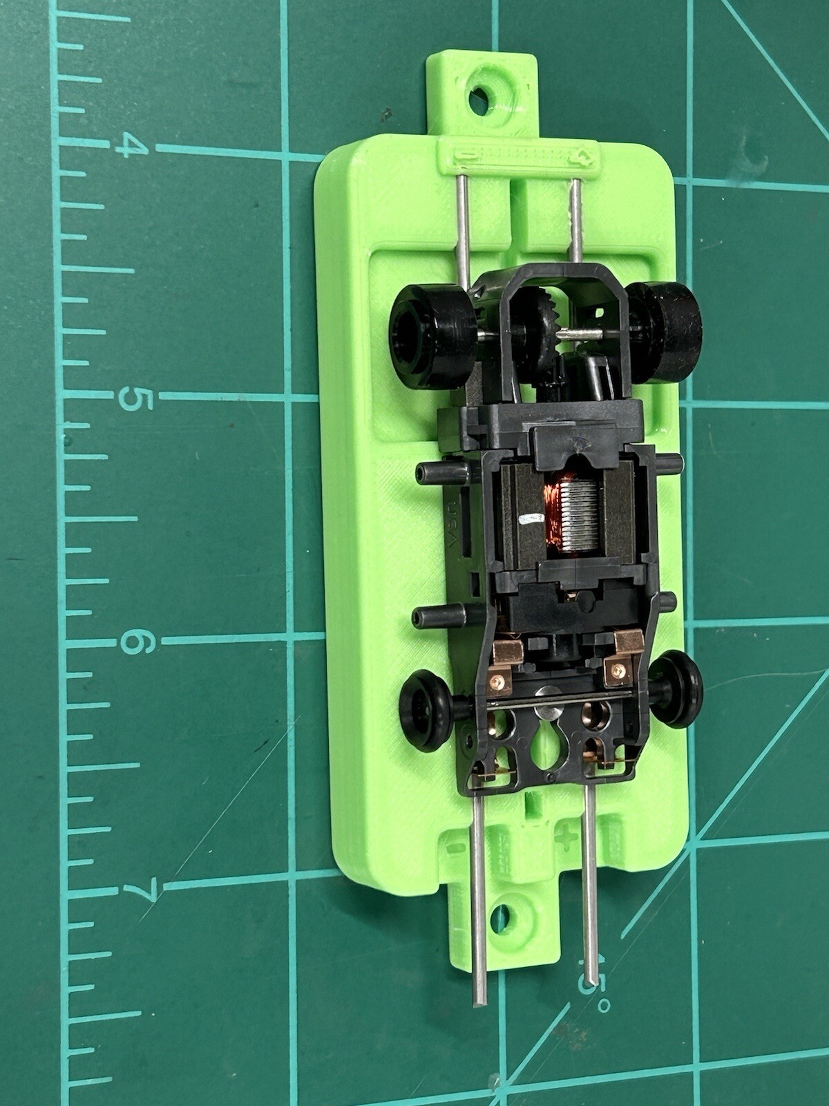 This is for SLOT CAR New style break in stand works with or without body fits many Chassis including HC slots Super 7 , Viper , Tyco AFX and many more just hook to a 9v battery or a power supply to run chassis for warm up or break in . Stand ONLY chassis are for display only. Condition is New color may vary Other colors availble See other auctions or message me