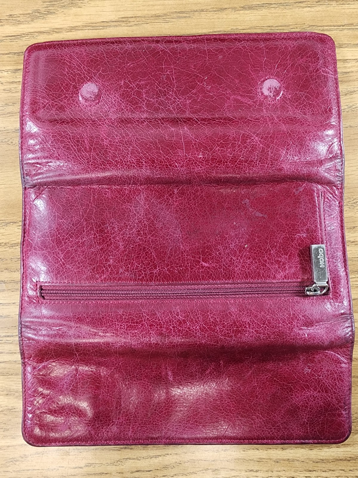 The HOBO International Burgundy Leather Trifold Wallet is a stylish and functional accessory designed for women. Made from high-quality leather, this wallet features a solid burgundy color and a tri-fold design for easy storage and organization. It includes multiple compartments for credit cards, a checkbook, and coins, providing convenience and functionality. The interior is crafted from durable fabric, ensuring longevity and a clean appearance. Perfect for everyday use, this wallet is a practical and chic addition to any accessory collection.