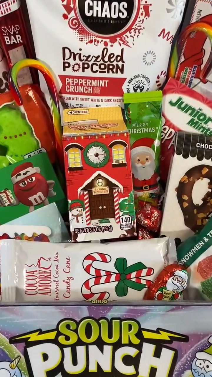 This Holiday Snacking gift box is a festive and heartwarming gift for family and friends during the holiday season. WE START SHIPPING HOLIDAY BASKETS DEC 1 - Unless you message us with a different date. This gift basket is hand-packed with a variety of candies and delightful treats to spread holiday cheer. Everything from Gourmet peppermint popcorn ~ Hot cocoa ~ A chocolate Bavarian pretzel to Sour candy and Peeps plus so much more! *Gift comes in a White craft gift box with a red/green bow and crinkle shreds, then placed in a shipping box. Anything breakable will be bubble wrapped to ensure it arrives intact. Items will be beautifully layered in box. Please message me with any questions- please allow extra transit time from USPS. If you need this shipped at a later date please message me. This set includes: 1~ Gourmet Peppermint Popcorn Bag~ Delicious! 1~Peppermint Candy Junior Mints Box ~ Full size box! 1~ Frosty the Snowman Gummies~ Full size box. 1~ Andes Snap Bar. 1~ Peeps Tree Package. 1~ Large Sour Punch Arctic Straws. 1~ Albanese Holiday Gummy Candy Package. 1~ Holiday Skittles Box. 1~ M&M Holiday Box. 1~ Whoppers Holiday House Box ~ How Fun! 1~ Gourmet Chocolate Bavarian Pretzel. 1~ Muddy Buddies Holiday Bag. 1~ Candy Cane Hot Cocoa Package. * If you choose to upgrade you will have 5 total cocoa's 2~ Hershey's Chocolate Santa's.- Snack Size 2~ Skittles Cany Canes. 1~ Mini Santa Marshmallow. Assorted chocolates sprinkled in for that extra touch! Thanks for looking! Checkout our store for more fun gifting ideas!