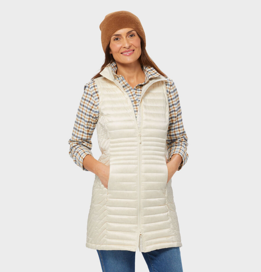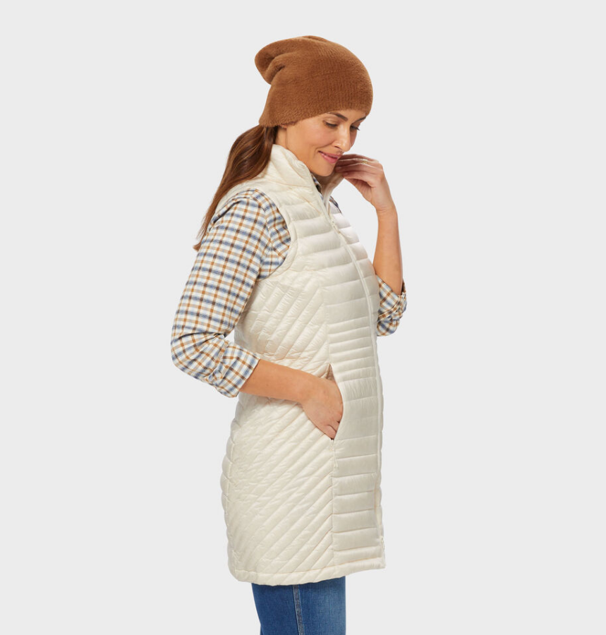 HOT DEAL Du.luth Women's Down Right Long Vest, Antique White Down Right Tunic Vest Has Warmth Down to a Science Our lightweight vest is down warmth done right – no more huffin’ and puffin’ from the weight of preposterously poofy outerwear. The Down Right Tunic Vest combines 650-fill-power duck down with a slimming and professional style, so you’ll feel all bundled up without looking puffed out. DWR finish means water beads right off, and wind is withered to a whistle. Variegated quilting lends a flattering shape at the waist. Packable design lets you compress this vest inside its own pocket for smart storage. Features Light-as-air down vest takes away the brrrrr and the bulk! 100% nylon with DWR finish is wind and water resistant Packs down into interior pocket for easy storing 650-fill-power duck down 3 total pockets, including brushed tricot hand pockets and an interior zip pocket Down-proof feature prevents pesky puffs from escaping Full collar with brushed tricot lining keeps the chill off your chin Tunic length keeps your caboose cozy 2-way-open zipper Fabrication + Care 100% nylon fabric Filling: Minimum 90% duck down, 10% feathers; TBD Machine wash Imported