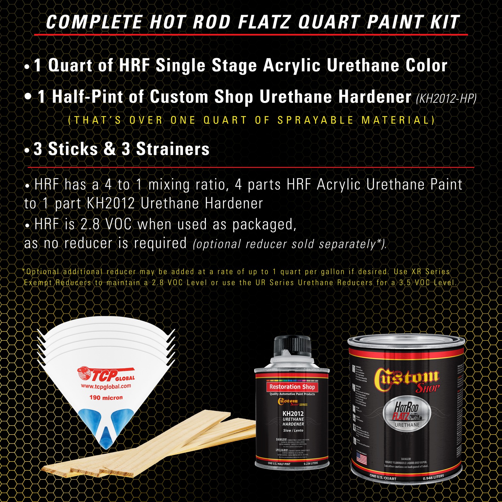 TCP Global Ebay Storefront Ordering | Shipping | Returns | International Product Information FLAMMABLE/HAZARDOUS ITEMS ARE SHIPPED VIA UPS GROUND/STANDARD TO THE LOWER 48 U.S. STATES & CANADA. ***SHIPPING VIA U.S. POSTAL SERVICE OR TO A P.O. BOX IS NOT AVAILABLE.*** RUSH AIR SHIPPING IS AVAILABLE IN CONTINENTAL U.S. FOR AN ADDITIONAL HAZMAT AIR SHIPPING CHARGE. CONTACT US PRIOR TO ORDERING FOR AIR SHIPPING QUOTE. IF ORDER IS PLACE FOR AIR SHIPPING YOU WILL BE CONTACTED FOR ADDITIONAL SHIPPING PAYMENT. INTERNATIONAL SHIPPING IS AVAILABLE. CONTACT US FOR SHIPPING QUOTE PRIOR TO ORDERING. Part# KUS KIT-HRF1403-M-QT Boss Yellow - Hot Rod Flatz Flat Matte Satin Urethane Auto Paint - Complete Quart Paint Kit - Professional Low Sheen Automotive, Car Truck Coating, 4:1 Mix Ratio Note: Monitors vary - onscreen colors are for general color reference only. Complete 1 Quart Custom Shop Hot Rod Flatz Acrylic Urethane Auto Paint Kit. The kit provides over 1 quart of sprayable material. It has a 4 to 1 mix ratio and is 2.8 VOC when used as packaged, as no reducer is required (optional XR & UR series reducers sold separately). Paint Kit includes 1 Quart of Hot Rod Flatz Single Stage Acrylic Urethane Paint Color, 1 Half-Pint of Custom Shop Urethane Hardener (KH2012-HP), 3 Pack of 190 Micron Nylon Automotive Strainers, and a 3 Pack of Wood Paint Mixing Sticks. Hot Rod Flatz Acrylic Urethane System is a high-performance professional, easy-to-use single-stage paint coating system designed for overall automotive refinishing. No clearcoat is required or recommended. Pre-flattened ready to spray low-gloss color with a consistent satin sheen with the desired 30-degree satin primer appearance. A very durable, chemical, and solvent-resistant coating that also resists chipping and cracking and contains UV inhibitors to protect your finish from fading and chalking like traditional primers. Custom Shop Products are Made in the U.S.A., and we formulate, manufacture, and distribute our products throughout the USA. Our superior coating products only use the highest quality ingredients, which allows our customers to achieve consistent, high-quality professional results on all their painting projects! Complete Sprayable Quart Kit Complete 1 Quart Custom Shop Hot Rod Flatz Acrylic Urethane Auto Paint Kit. The kit provides over 1 quart of sprayable material. It has a 4 to 1 mix ratio and is 2.8 VOC when used as packaged, as no reducer is required (optional XR & UR series reducers sold separately). Paint Kit includes 1 Quart of Hot Rod Flatz Single Stage Acrylic Urethane Paint Color, 1 Half-Pint of Custom Shop Urethane Hardener (KH2012-HP), 3 Pack of 190 Micron Nylon Automotive Strainers, and a 3 Pack of Wood Paint Mixing Sticks. Hot Rod Flatz Acrylic Urethane System is a high-performance professional, easy-to-use single-stage paint coating system designed for overall automotive refinishing. No clearcoat is required or recommended. Pre-flattened ready to spray low-gloss color with a consistent satin sheen with the desired 30-degree satin primer appearance. A very durable, chemical, and solvent-resistant coating that also resists chipping and cracking and contains UV inhibitors to protect your finish from fading and chalking like traditional primers. Custom Shop Products are Made in the U.S.A., and we formulate, manufacture, and distribute our products throughout the USA. Our superior coating products only use the highest quality ingredients, which allows our customers to achieve consistent, high-quality professional results on all their painting projects! View all categories Warehouse Locations Las Vegas, Nevada South Carolina