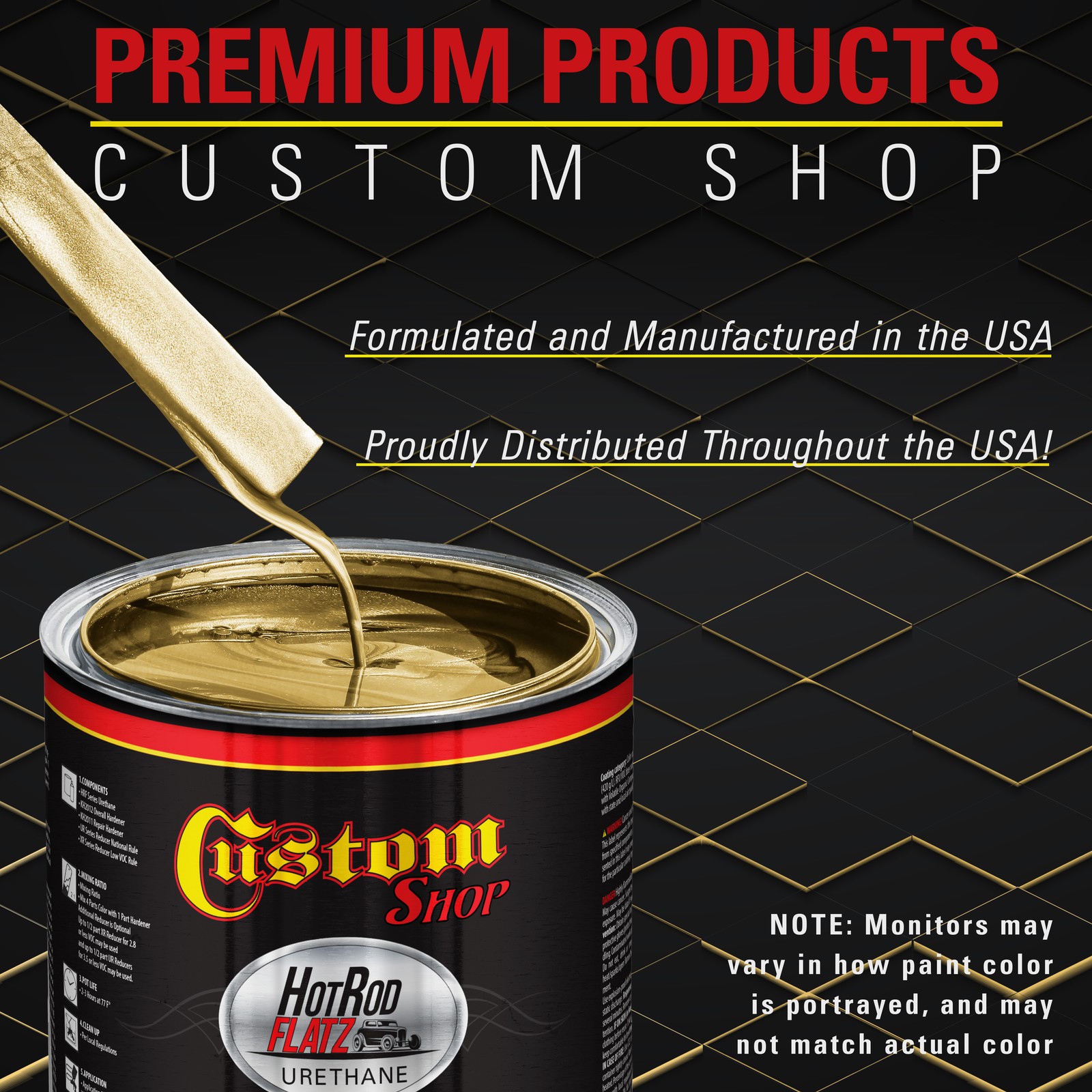 TCP Global Ebay Storefront Ordering | Shipping | Returns | International Product Information FLAMMABLE/HAZARDOUS ITEMS ARE SHIPPED VIA UPS GROUND/STANDARD TO THE LOWER 48 U.S. STATES & CANADA. ***SHIPPING VIA U.S. POSTAL SERVICE OR TO A P.O. BOX IS NOT AVAILABLE.*** RUSH AIR SHIPPING IS AVAILABLE IN CONTINENTAL U.S. FOR AN ADDITIONAL HAZMAT AIR SHIPPING CHARGE. CONTACT US PRIOR TO ORDERING FOR AIR SHIPPING QUOTE. IF ORDER IS PLACE FOR AIR SHIPPING YOU WILL BE CONTACTED FOR ADDITIONAL SHIPPING PAYMENT. INTERNATIONAL SHIPPING IS AVAILABLE. CONTACT US FOR SHIPPING QUOTE PRIOR TO ORDERING. Part# KUS KIT-HRF266-M-QT Old Gold Metallic - Hot Rod Flatz Flat Matte Satin Urethane Auto Paint - Complete Quart Paint Kit - Professional Low Sheen Automotive, Car Truck Coating, 4:1 Mix Ratio Note: Monitors vary - onscreen colors are for general color reference only. Complete 1 Quart Custom Shop Hot Rod Flatz Acrylic Urethane Auto Paint Kit. The kit provides over 1 quart of sprayable material. It has a 4 to 1 mix ratio and is 2.8 VOC when used as packaged, as no reducer is required (optional XR & UR series reducers sold separately). Paint Kit includes 1 Quart of Hot Rod Flatz Single Stage Acrylic Urethane Paint Color, 1 Half-Pint of Custom Shop Urethane Hardener (KH2012-HP), 3 Pack of 190 Micron Nylon Automotive Strainers, and a 3 Pack of Wood Paint Mixing Sticks. Hot Rod Flatz Acrylic Urethane System is a high-performance professional, easy-to-use single-stage paint coating system designed for overall automotive refinishing. No clearcoat is required or recommended. Pre-flattened ready to spray low-gloss color with a consistent satin sheen with the desired 30-degree satin primer appearance. A very durable, chemical, and solvent-resistant coating that also resists chipping and cracking and contains UV inhibitors to protect your finish from fading and chalking like traditional primers. Custom Shop Products are Made in the U.S.A., and we formulate, manufacture, and distribute our products throughout the USA. Our superior coating products only use the highest quality ingredients, which allows our customers to achieve consistent, high-quality professional results on all their painting projects! Complete Sprayable Quart Kit Complete 1 Quart Custom Shop Hot Rod Flatz Acrylic Urethane Auto Paint Kit. The kit provides over 1 quart of sprayable material. It has a 4 to 1 mix ratio and is 2.8 VOC when used as packaged, as no reducer is required (optional XR & UR series reducers sold separately). Paint Kit includes 1 Quart of Hot Rod Flatz Single Stage Acrylic Urethane Paint Color, 1 Half-Pint of Custom Shop Urethane Hardener (KH2012-HP), 3 Pack of 190 Micron Nylon Automotive Strainers, and a 3 Pack of Wood Paint Mixing Sticks. Hot Rod Flatz Acrylic Urethane System is a high-performance professional, easy-to-use single-stage paint coating system designed for overall automotive refinishing. No clearcoat is required or recommended. Pre-flattened ready to spray low-gloss color with a consistent satin sheen with the desired 30-degree satin primer appearance. A very durable, chemical, and solvent-resistant coating that also resists chipping and cracking and contains UV inhibitors to protect your finish from fading and chalking like traditional primers. Custom Shop Products are Made in the U.S.A., and we formulate, manufacture, and distribute our products throughout the USA. Our superior coating products only use the highest quality ingredients, which allows our customers to achieve consistent, high-quality professional results on all their painting projects! View all categories Warehouse Locations Las Vegas, Nevada South Carolina