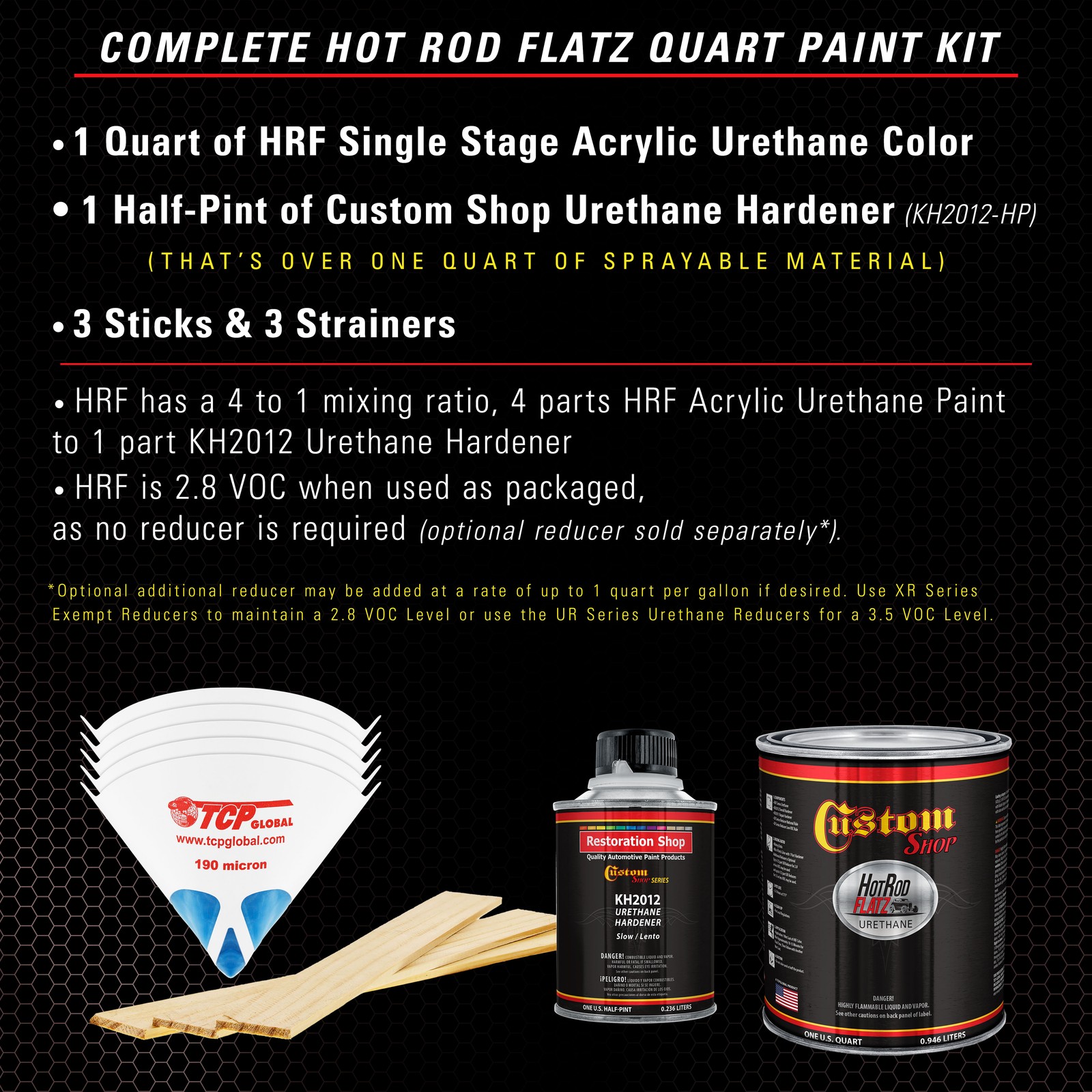 TCP Global Ebay Storefront Ordering | Shipping | Returns | International Product Information FLAMMABLE/HAZARDOUS ITEMS ARE SHIPPED VIA UPS GROUND/STANDARD TO THE LOWER 48 U.S. STATES & CANADA. ***SHIPPING VIA U.S. POSTAL SERVICE OR TO A P.O. BOX IS NOT AVAILABLE.*** RUSH AIR SHIPPING IS AVAILABLE IN CONTINENTAL U.S. FOR AN ADDITIONAL HAZMAT AIR SHIPPING CHARGE. CONTACT US PRIOR TO ORDERING FOR AIR SHIPPING QUOTE. IF ORDER IS PLACE FOR AIR SHIPPING YOU WILL BE CONTACTED FOR ADDITIONAL SHIPPING PAYMENT. INTERNATIONAL SHIPPING IS AVAILABLE. CONTACT US FOR SHIPPING QUOTE PRIOR TO ORDERING. Part# KUS KIT-HRF261-M-QT Vintage Burgundy Pearl - Hot Rod Flatz Flat Matte Satin Urethane Auto Paint - Complete Quart Paint Kit - Professional Low Sheen Automotive, Car Truck Coating, 4:1 Mix Ratio Note: Monitors vary - onscreen colors are for general color reference only. Complete 1 Quart Custom Shop Hot Rod Flatz Acrylic Urethane Auto Paint Kit. The kit provides over 1 quart of sprayable material. It has a 4 to 1 mix ratio and is 2.8 VOC when used as packaged, as no reducer is required (optional XR & UR series reducers sold separately). Paint Kit includes 1 Quart of Hot Rod Flatz Single Stage Acrylic Urethane Paint Color, 1 Half-Pint of Custom Shop Urethane Hardener (KH2012-HP), 3 Pack of 190 Micron Nylon Automotive Strainers, and a 3 Pack of Wood Paint Mixing Sticks. Hot Rod Flatz Acrylic Urethane System is a high-performance professional, easy-to-use single-stage paint coating system designed for overall automotive refinishing. No clearcoat is required or recommended. Pre-flattened ready to spray low-gloss color with a consistent satin sheen with the desired 30-degree satin primer appearance. A very durable, chemical, and solvent-resistant coating that also resists chipping and cracking and contains UV inhibitors to protect your finish from fading and chalking like traditional primers. Custom Shop Products are Made in the U.S.A., and we formulate, manufacture, and distribute our products throughout the USA. Our superior coating products only use the highest quality ingredients, which allows our customers to achieve consistent, high-quality professional results on all their painting projects! Complete Sprayable Quart Kit Complete 1 Quart Custom Shop Hot Rod Flatz Acrylic Urethane Auto Paint Kit. The kit provides over 1 quart of sprayable material. It has a 4 to 1 mix ratio and is 2.8 VOC when used as packaged, as no reducer is required (optional XR & UR series reducers sold separately). Paint Kit includes 1 Quart of Hot Rod Flatz Single Stage Acrylic Urethane Paint Color, 1 Half-Pint of Custom Shop Urethane Hardener (KH2012-HP), 3 Pack of 190 Micron Nylon Automotive Strainers, and a 3 Pack of Wood Paint Mixing Sticks. Hot Rod Flatz Acrylic Urethane System is a high-performance professional, easy-to-use single-stage paint coating system designed for overall automotive refinishing. No clearcoat is required or recommended. Pre-flattened ready to spray low-gloss color with a consistent satin sheen with the desired 30-degree satin primer appearance. A very durable, chemical, and solvent-resistant coating that also resists chipping and cracking and contains UV inhibitors to protect your finish from fading and chalking like traditional primers. Custom Shop Products are Made in the U.S.A., and we formulate, manufacture, and distribute our products throughout the USA. Our superior coating products only use the highest quality ingredients, which allows our customers to achieve consistent, high-quality professional results on all their painting projects! View all categories Warehouse Locations Las Vegas, Nevada South Carolina