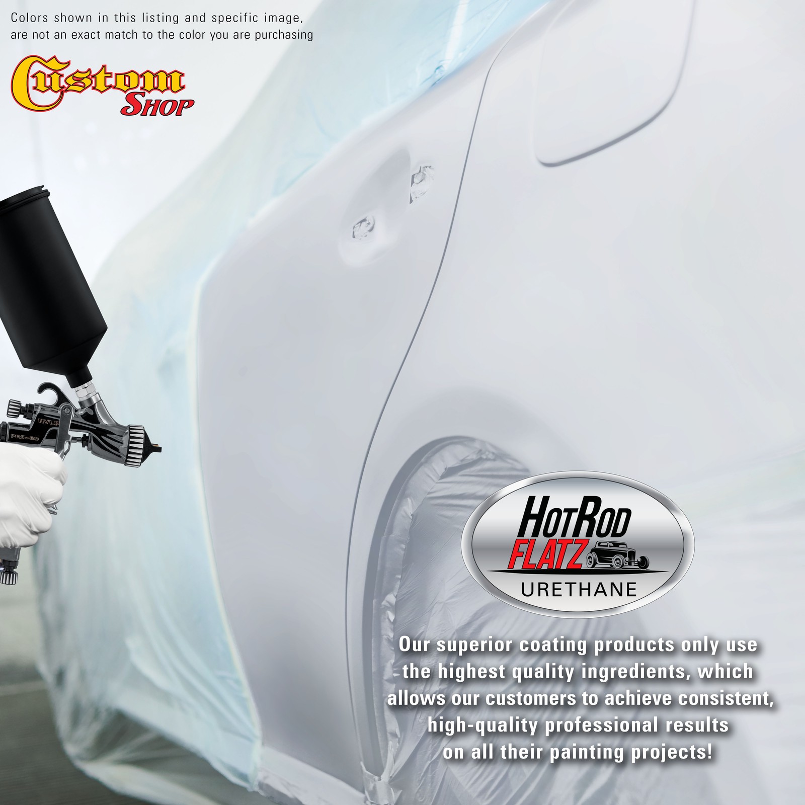 TCP Global Ebay Storefront Ordering | Shipping | Returns | International Product Information FLAMMABLE/HAZARDOUS ITEMS ARE SHIPPED VIA UPS GROUND/STANDARD TO THE LOWER 48 U.S. STATES & CANADA. ***SHIPPING VIA U.S. POSTAL SERVICE OR TO A P.O. BOX IS NOT AVAILABLE.*** RUSH AIR SHIPPING IS AVAILABLE IN CONTINENTAL U.S. FOR AN ADDITIONAL HAZMAT AIR SHIPPING CHARGE. CONTACT US PRIOR TO ORDERING FOR AIR SHIPPING QUOTE. IF ORDER IS PLACE FOR AIR SHIPPING YOU WILL BE CONTACTED FOR ADDITIONAL SHIPPING PAYMENT. INTERNATIONAL SHIPPING IS AVAILABLE. CONTACT US FOR SHIPPING QUOTE PRIOR TO ORDERING. Part# KUS KIT-HRF1103-M-GL Winter White - Hot Rod Flatz Flat Matte Satin Urethane Auto Paint - Complete Gallon Paint Kit - Professional Low Sheen Automotive, Car Truck Coating, 4:1 Mix Ratio Note: Monitors vary - onscreen colors are for general color reference only. Complete 1 Gallon Custom Shop Hot Rod Flatz Acrylic Urethane Auto Paint Kit. The kit provides 5 quarts (1 gallon + 1 quart) of sprayable material. It has a 4 to 1 mix ratio and is 2.8 VOC when used as packaged, as no reducer is required (optional XR & UR series reducers sold separately). Paint Kit includes 1 Gallon of Hot Rod Flatz Single Stage Acrylic Urethane Paint Color, 1 Quart of Custom Shop Urethane Hardener (KH2012-QT), 5 Pack of 190 Micron Nylon Automotive Strainers, and a 5 Pack of Wood Paint Mixing Sticks. Hot Rod Flatz Acrylic Urethane System is a high-performance professional, easy-to-use single-stage paint coating system designed for overall automotive refinishing. No clearcoat is required or recommended. Pre-flattened ready to spray low-gloss color with a consistent satin sheen with the desired 30-degree satin primer appearance. A very durable, chemical, and solvent-resistant coating that also resists chipping and cracking and contains UV inhibitors to protect your finish from fading and chalking like traditional primers. Custom Shop Products are Made in the U.S.A., and we formulate, manufacture, and distribute our products throughout the USA. Our superior coating products only use the highest quality ingredients, which allows our customers to achieve consistent, high-quality professional results on all their painting projects! Complete Sprayable Gallon Kit Complete 1 Gallon Custom Shop Hot Rod Flatz Acrylic Urethane Auto Paint Kit. The kit provides 5 quarts (1 gallon + 1 quart) of sprayable material. It has a 4 to 1 mix ratio and is 2.8 VOC when used as packaged, as no reducer is required (optional XR & UR series reducers sold separately). Paint Kit includes 1 Gallon of Hot Rod Flatz Single Stage Acrylic Urethane Paint Color, 1 Quart of Custom Shop Urethane Hardener (KH2012-QT), 5 Pack of 190 Micron Nylon Automotive Strainers, and a 5 Pack of Wood Paint Mixing Sticks. Hot Rod Flatz Acrylic Urethane System is a high-performance professional, easy-to-use single-stage paint coating system designed for overall automotive refinishing. No clearcoat is required or recommended. Pre-flattened ready to spray low-gloss color with a consistent satin sheen with the desired 30-degree satin primer appearance. A very durable, chemical, and solvent-resistant coating that also resists chipping and cracking and contains UV inhibitors to protect your finish from fading and chalking like traditional primers. Custom Shop Products are Made in the U.S.A., and we formulate, manufacture, and distribute our products throughout the USA. Our superior coating products only use the highest quality ingredients, which allows our customers to achieve consistent, high-quality professional results on all their painting projects! View all categories Warehouse Locations Las Vegas, Nevada South Carolina