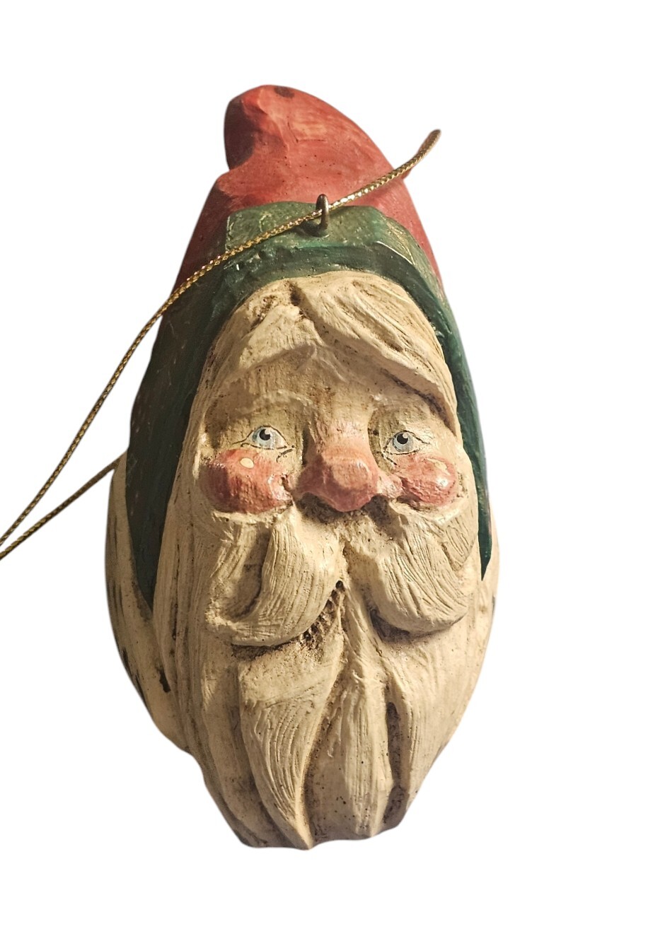 The product is a House of Hatten ornament from the 1988 collection designed by Denise Calla. It features a Santa head shelf sitter, perfect for decorating during the Christmas season. This handcrafted ornament embodies the theme of Christmas and is a charming addition to any holiday decor.
