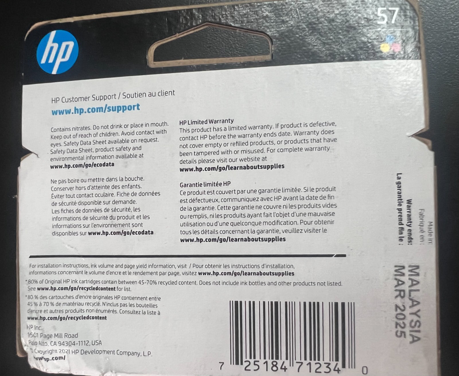 The HP 57 Tri-Color Cyan Yellow Magenta Ink Printer Cartridge 2302/OB is a single unit ink cartridge designed for inkjet and thermal print technology. With an expiration date of 3/2025, this cartridge is compatible with various universal printers, specifically those made by HP. The vibrant colors of cyan, yellow, and magenta ensure high-quality prints for your documents and images. Ideal for those in need of reliable and long-lasting printer ink cartridges, the HP 57 model is a dependable choice for both home and office use.