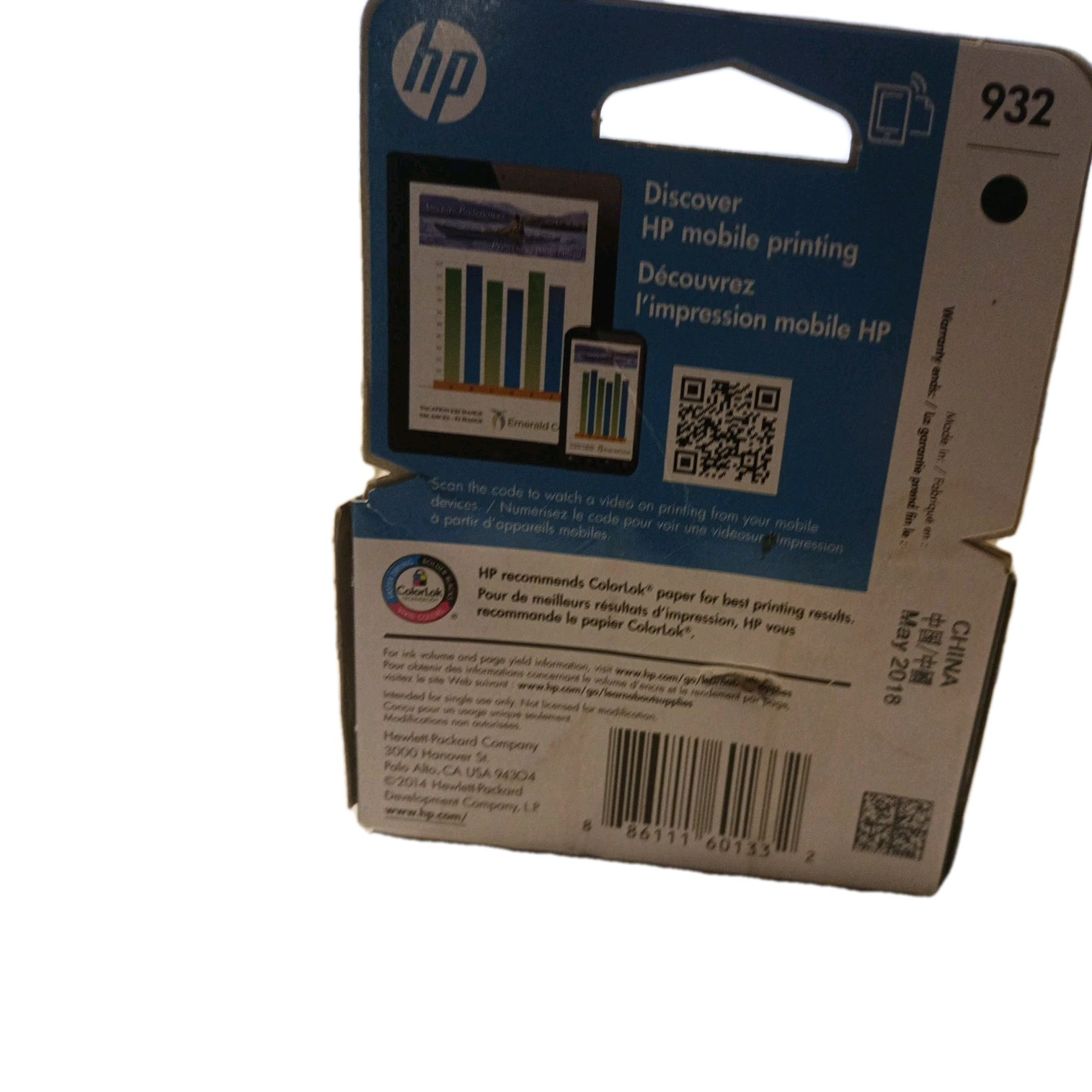 This is an HP 932 black ink cartridge manufactured in China in 2018. It is compatible with HP printers and is designed to provide high-quality black printing.