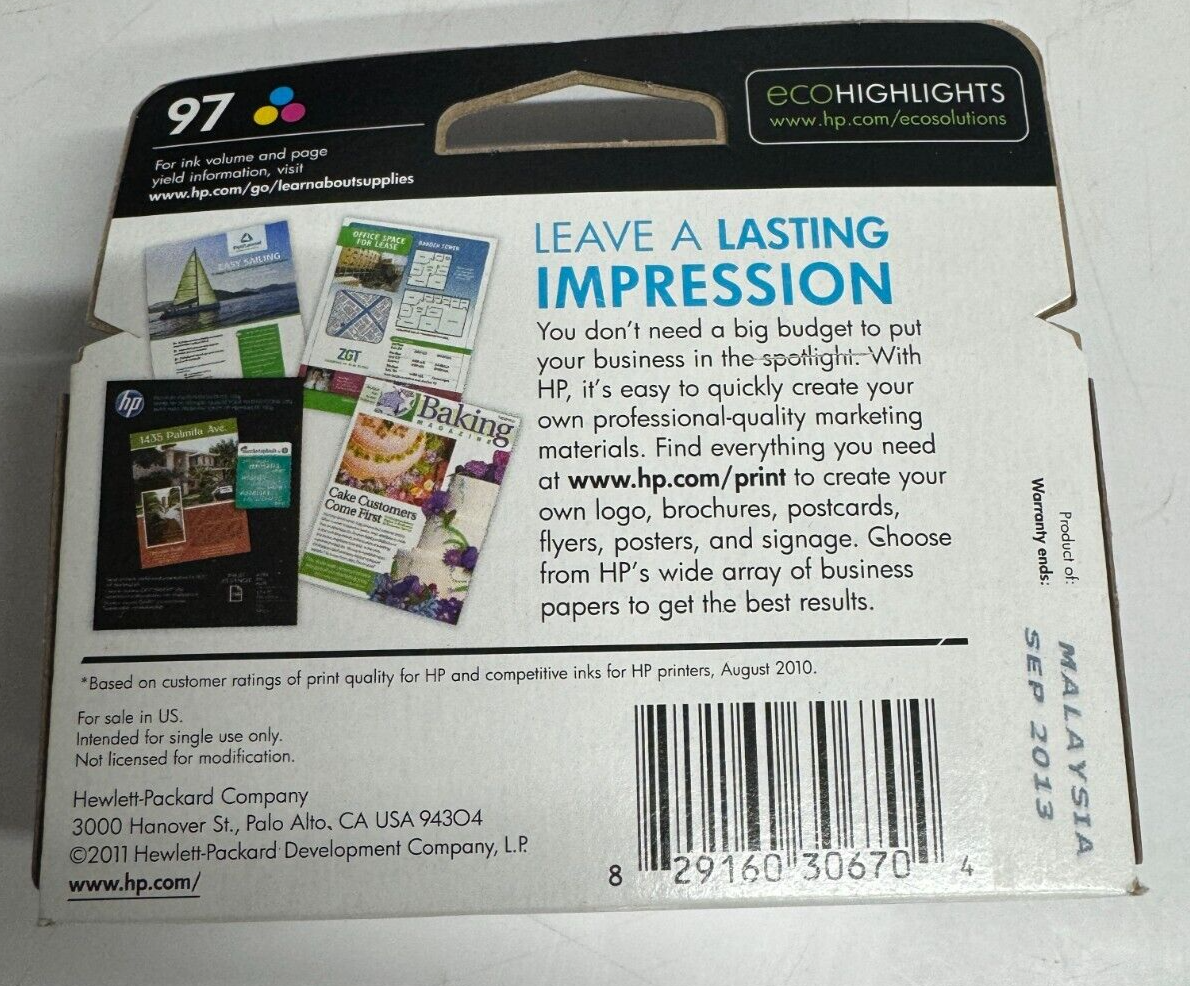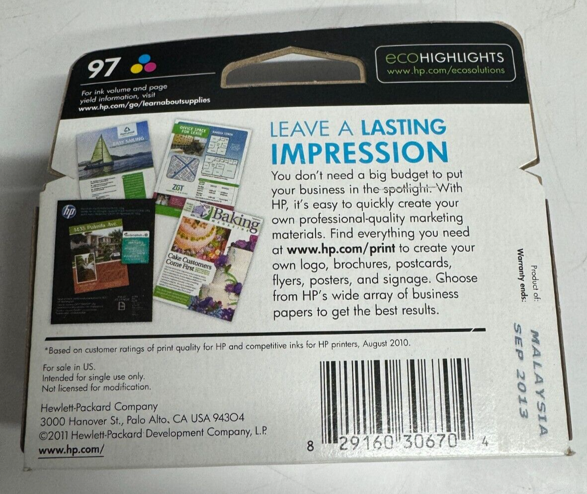 NEW 2- SEP '13 SEP '11 This HP 97 tri-color ink cartridge is a genuine and original product designed for HP printers. It is compatible with HP printers and has a print technology of inkjet. The color of the ink cartridge is tri-color and the model number is 97. This item is an open box product that comes with sealed ink, but please note that the ink expired in May '12. It falls under the categories of Ink Cartridges, Printer Ink, Toner & Paper, Printers, Scanners & Supplies, and Computers/Tablets & Networking. Purchase this ink cartridge to ensure high-quality prints from your HP printer. Thank you for your interest in this item. I often have several related items so please look through my store before you finalize your purchase. I have 2 eBay stores, one for new/like new items and one for used items. Please check them both out. New: https://www.ebay.com/str/dbjnew Used: https://www.ebay.com/str/dbjbuysell Before you purchase: 1) Please ask any questions you may have. 2) Check description for any special info. 3) Almost all items come with some sort of money back guarantee, but check just in case. 4) If you want a different or specific shipping option, this must be worked out BEFORE the purchase. 5) Know that if/when items are able to be combined in shipping if there are excess funds they are typically refunded. Ebay usually combines the shipping prices automatically so often the amount you pay is the combined shipping price. At the time of purchase: 1) Some of my items, especially larger or heavier items, have a couple of shipping options so choose the one right for you. 2) I am located in Midland, TX; so if you are local and would like to pick up, please let me know before payment so I can remove the shipping, making your item cheaper. After you purchase: 1) Items will almost always within 2 business days. Weekends and holidays do not count toward those days. 2) Sometimes, but not often, ups and usps may be switched out as long as the estimated shipping dates are the same. 3) When you get your item please check it thoroughly to make sure there are no problems. 4) If there is a problem, please let me know before you leave feedback to give me opportunity to solve the problem. 5) Typically feedback is given 4-5 days after delivery to ensure the entire transaction goes well. If you leave feedback before me, my feedback triggers automatically.