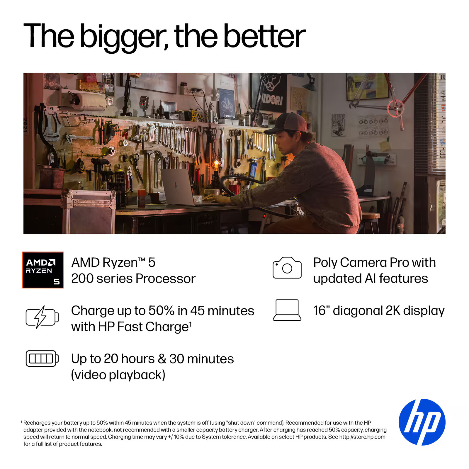 Expert Service. Unbeatable Price. About Us Contact Us Payment Shipping Store Pick Up Returns Best Buy Logo Welcome to the Best Buy eBay Store HP - OmniBook X Flip 2-in-1 16" 2K Touch-Screen Laptop - AMD Ryzen 5 - 8GB Memory - 512GB SSD - Meteor Silver Whether youre creating or being entertained, steal the show with the versatile and stylish HP OmniBook X Flip. The large 16" 2K touch display ensures you always have the best seat in the house, while the flexibility to use it flipped, folded, or flat ensures that its also the most comfortable and productive. Designed for the spotlight, its engineered with recycled metal and comes with a modern backlit keyboard. Included Items HP OmniBook X Flip 16" Laptop PC 65 W USB Type-C power adapter Setup instructions Features Windows 11 Home Operating System All the best elements of Windows 10, with added features to make it easier to log in to start working, gaming, or creating. AMD Ryzen 5 220 Processor Where performance elevates everyday experiences, the AMD Ryzen processor provides the technology you need to harness the power of advanced computing with introductory AI experiences. 8GB LPDDR5 Memory (RAM) Experience speedy and responsive performance with power efficiency. Designed to support higher data rates with less latency, plus faster file transfers and application load. AMD Radeon 740M Graphics The impressive power of built-in AMD Radeon graphics for impressive visual fidelity and the performance to play games in high definition. 512GB Solid State Drive (SSD) Storage With high-speed data transfer, the PCIe Gen4 NVMe M.2 SSD offers fast speed and efficient storage. 16-Inch 2K Touchscreen With IPS Intuitive touchscreen technology lets you control your PC with taps, swipes, and pinches. Add an optional stylus for controlled sketching and editing. AMD FreeSync Technology optimizes refresh rates for flawless sync with your gaming and multimedia graphics, making excellent use of the 1920x1200 screen resolution and 178-degree wide-viewing angles. Multitouch-enabled, IPS (in-plane switching), edge-to-edge glass. HP Fast Charge In addition to long lasting battery life, this laptop optimizes charging to go from 0 to 50% in approximately 45 minutes.¹ Wi-Fi 6E (2x2) And Bluetooth 5.3 Wireless Card Expanding the faster speeds and improved performance of Wi-Fi 6 into the 6 GHz band. Excellent for fast data transfers. Microsoft Copilot Do more with AI as your personal assistant. Kickstart new projects with relevant answers, simplified solutions, and helpful advice. Copilot in Windows 11 is ready to support you whenever and wherever you need it. Poly Studio Audio With Dual Speakers HP + Poly together will continuously accelerate innovation across our hybrid solutions, including AI-generated technology. With pitch perfect audio, you'll get the best experience to collaborate anywhere with audio tuned by Poly Studio. DTS: X Ultra Technology Spatially accurate, 3D sound drops you into the middle of your favorite games, movies, and music with a level of depth and immersion you can feel. Advanced AI Noise Reduction Enjoy clearer team conversations with AI noise reduction. Using the Advanced Personal Mode, it tracks only your voice during conference calls while automatically filtering out noises and other speakers for distinctively focused communications. Poly Camera Pro Elevate your video calls with help from AI to enhance virtual interactions, customizable settings and professional grade features across all collaboration and streaming apps, without sacrificing performance or battery. HP 5MP IR Camera With HDR Switch Take visually stunning works of art with HP 5MP IR camera with HDR switch capabilities. With High Dynamic Range and 16:10 aspect ratio you get HD content natively, so you can capture more gradients between lights and darks for truer color accuracy. Greater Peace Of Mind Ensure your privacy with a visible shutter that turns off your PC's camera. Easily activate the mic mute button on your keyboard. An LED indicator light lets you know when it's on or off. Ports 1 USB Type-C (40Gbps, USB Power Delivery, DisplayPort 1.4a, HP Sleep and Charge), 1 USB Type-C (10Gbps, USB Power Delivery, DisplayPort 1.4a, HP Sleep and Charge), 2 USB Type-A (10Gbps), 1 headphone/microphone combo, 1 HDMI 2.1. Weighs 4.18 lbs. And Measures 0.61" Thin This flexible Flip PC is made from sleek recycled metal that looks as good as it performs. Making Responsible Choices Designed using responsible materials like ocean-bound and post-consumer recycled plastic, and recycled metal to help drive progress toward a more sustainable future. Try PC Game Pass For Free Play hundreds of high-quality PC games on your new HP device with 3 free months of PC Game Pass including EA Play. With new games being added all the time, theres always something new to play. Specifications Brand: HP Model Number: 16-be0003dx Product Name: OmniBook X Flip 2-in-1 16" 2K Touch-Screen Laptop - AMD Ryzen 5 - 8GB Memory - 512GB SSD Color: Meteor Silver Display Type: LED Screen Type: IPS Screen Size: 16 inches Screen Resolution: 1920 x 1200 (Full HD+) Touch Screen: true Synchronization Technology: FreeSync (AMD Adaptive Sync) Brightness: 400 nits Color Gamut (Standard RGB): 62.5 percent Processor Brand: AMD Processor Model: AMD Ryzen 200 Series Processor Model Number: 220 CPU Boost Clock Frequency: 4.9 gigahertz Number of CPU Cores: 6-core CPU Cache Memory Level: L3 L3 Cache: 16 megabytes Neural Processing Unit (NPU): false Storage Type: SSD Total Storage Capacity: 512 gigabytes Solid State Drive Capacity: 512 gigabytes Solid State Drive Interface: PCIe 4.0 System Memory (RAM): 8 gigabytes Type of Memory (RAM): LPDDR5 System Memory RAM Speed: 6400 megahertz Graphics Type: Integrated GPU Brand: AMD Radeon Graphics: AMD Radeon 740M Operating System: Windows 11 Home Display Connector(s): 1 x HDMI 2.1 Number of HDMI Outputs (Total): 1 USB Ports: 1 x USB-C 4, 1 x USB-C 3.1, 2 x USB-A 3.1 Number of USB Ports (Total): 4 