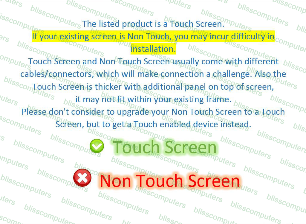 HP TouchSmart 15-AY013DS 15-AY013DX 15.6" LCD LED Screen Touch Verification Note 1. We need your laptop model and serial number / service tag to match up screen technical information. Ghost Touch, Running Touch, No-Touch, and Inverted Touch are not screen related issues. Kindly check your digitizer board and cable since they are the most likely cause of any touch issue; please do not open a return claiming the touch did not work. If the machine has a weakened or fragile digitizer board, the replacement unit or assembly will not have proper touch or in some cases it may not have touch at all. Important Note Provide Laptop serial number if you are clueless about screen you need. Part number: HP 809612-010 B156XTK01.0 B156XTK01.0 Model number: HP 15-AY138CA NOTEBOOK HP 15-AY172DX Notebook HP 15-ay015ds Notebook PC HP 15-ay096nr Notebook PC HP 15-ay102xx Notebook MVIUR HP NOTEBOOK 15-AY009DX HP NOTEBOOK 15-AY013CY HP NOTEBOOK 15-AY013DS HP NOTEBOOK 15-AY013DX HP NOTEBOOK 15-AY014CY HP NOTEBOOK 15-AY014DS HP NOTEBOOK 15-AY014DX HP NOTEBOOK 15-AY015CY HP NOTEBOOK 15-AY016CY HP NOTEBOOK 15-AY016DS HP NOTEBOOK 15-AY017CY HP NOTEBOOK 15-AY017DS HP NOTEBOOK 15-AY018CA HP NOTEBOOK 15-AY018CY HP NOTEBOOK 15-AY018DS HP NOTEBOOK 15-AY019CY HP NOTEBOOK 15-AY019DS HP NOTEBOOK 15-AY020CY HP NOTEBOOK 15-AY020DS HP NOTEBOOK 15-AY021DS HP NOTEBOOK 15-AY022DS HP NOTEBOOK 15-AY023DS HP NOTEBOOK 15-AY024DS HP NOTEBOOK 15-AY025DS HP NOTEBOOK 15-AY028CA HP NOTEBOOK 15-AY041WM HP NOTEBOOK 15-AY043CA HP NOTEBOOK 15-AY053CA HP NOTEBOOK 15-AY053NR HP NOTEBOOK 15-AY071NR HP NOTEBOOK 15-AY081NR HP NOTEBOOK 15-AY083NR HP NOTEBOOK 15-AY091MS HP NOTEBOOK 15-AY103DX HP NOTEBOOK 15-AY122CL HP NOTEBOOK 15-AY127CA HP NOTEBOOK 15-AY127CL HP NOTEBOOK 15-AY128CA HP NOTEBOOK 15-AY147CL HP NOTEBOOK 15-AY167CL HP NOTEBOOK 15-AY169NR HP NOTEBOOK 15-AY191MS HP NOTEBOOK 15-AY196NR HP NOTEBOOK 15-BA010CA HP NOTEBOOK 15-BA013CL HP NOTEBOOK 15-BA013DS HP NOTEBOOK 15-BA014DS HP NOTEBOOK 15-BA015DS HP NOTEBOOK 15-BA016DS HP NOTEBOOK 15-BA017DS HP NOTEBOOK 15-BA018DS HP NOTEBOOK 15-BA020CA HP NOTEBOOK 15-BA021CA HP NOTEBOOK 15-BA022CA HP NOTEBOOK 15-BA023CA HP NOTEBOOK 15-BA024CA HP NOTEBOOK 15-BA025CA HP NOTEBOOK 15-BA030NR HP NOTEBOOK 15-BA036CA HP NOTEBOOK 15-BA038CA HP NOTEBOOK 15-BA040CA HP NOTEBOOK 15-BA040NR HP NOTEBOOK 15-BA043WM HP NOTEBOOK 15-BA049CA HP NOTEBOOK 15-BA051WM HP NOTEBOOK 15-BA052WM HP NOTEBOOK 15-BA057CA HP NOTEBOOK 15-BA062NR HP NOTEBOOK 15-BA078DX HP NOTEBOOK 15-BA079DX HP NOTEBOOK 15-BA081NR HP NOTEBOOK 15-BA082NR HP NOTEBOOK 15-BA083NR HP NOTEBOOK 15-BA084NR HP NOTEBOOK 15-BA085NR HP NOTEBOOK 15-BA113CL HP NOTEBOOK 15-BA138CA HP NOTEBOOK 15-BA140CA HP NOTEBOOK 15T-AY000 HP NOTEBOOK 15T-AY100 HP NOTEBOOK 15Z-BA000 HP NOTEBOOK REFURB 15T-AY000 HP NOTEBOOK REFURB 15T-AY100 HP NOTEBOOK REFURB 15Z-BA000 HP Notebook 15-ay028la HP Notebook 15-ay150TU HP Notebook 15-ba021AU HP Notebook 15-ba022AU HP Notebook 15-ba052AU Dell P75F013 Inspiron 3593 Desc Note: This is #360 MM length Screen. The product is 40-pin connector, with invisible touch. It does not fit 30-pin. Title - HP 15-AY013DS, HP 15-AY013DX Important Notice About Your Order & Shipping You will receive only the item shown and paid for in the listing. Please note that we do not include free tape, adhesive, installation guides, or any other extras. As a business, we cannot provide free items, and we appreciate your understanding. Need Tape ? You can purchase it separately eBay Item 355286906103 Freight Forwarding Advisory We strongly advise against using freight forwarding companies, as they often mishandle packages—damaging boxes, altering packaging, or stacking heavy items on fragile ones. Since an extra party is involved in handling, FedEx, UPS, and USPS will not honor breakage claims , and unfortunately, we cannot assist with such damages either. If you must use a freight forwarder, we recommend: ✅ Asking them to double-box your package for extra protection. ✅ Purchasing insurance to cover any potential damage, as you’ll need to handle claims directly with the insurance provider. Our products contain fragile glass and are not designed for rough handling by freight forwarders. Please take precautions to protect your order. .