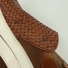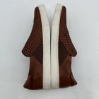 Good condition, with a couple blemishes as pictured. The H.S. Trask Woven Calfskin Brown Leather Slip On Sneakers are a stylish and comfortable option for men's casual shoes. Featuring an almond toe shape and genuine leather material, these sneakers have a slip-on closure for easy wearing. With a cushioned insole and rubber grip outsole, they are versatile for various occasions such as travel, activewear, casual outings, and workwear. The black color, logo accents, and high-quality construction make these sneakers a timeless addition to any wardrobe.