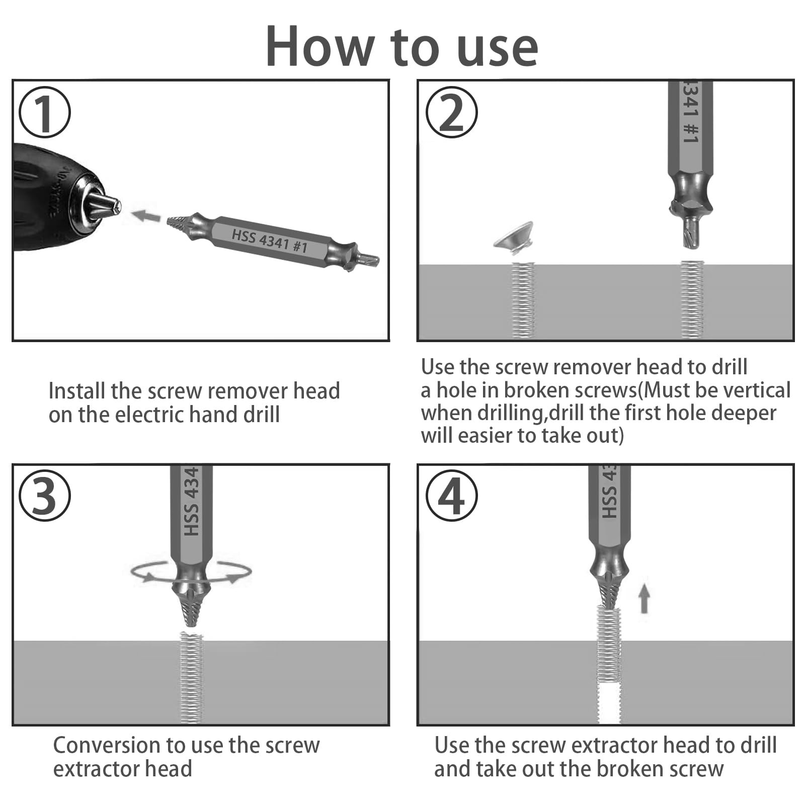 Transform your frustrating stripped screw situations into quick solutions with this professional-grade 5-piece damaged screw extractor set. Crafted from durable High Speed Steel (HSS), these specialized drill bits are designed to grip and remove stubborn stripped screws, nuts, and bolts with precision. Each extractor in the set (numbered from 0 to 4) features aggressive spiral flutes that bite into damaged fasteners, making removal straightforward and efficient. Perfect for both DIY enthusiasts and professional craftspeople, these tools excel at extracting rusty, broken, or worn-out hardware that standard screwdrivers can't budge. The distinctive grey finish helps resist corrosion, while the industrial-grade construction ensures lasting performance across numerous extraction jobs. Whether you're working on automotive repairs, furniture restoration, or general maintenance, this comprehensive set provides the reliable tools needed to tackle those challenging fastener removal tasks. SPECS: Material: HSS steel Shaft Type: Hex Shank; Size: 0#, 1#, 2#, 3#, 4# 0) Removes screw size: 2-4mm 1) Removes screw size: 3-5mm 2) Removes screw size: 4-8mm 3) Removes screw size: 5-10mm 4) Removes screw size: 6-12mm Easily removes screw and bolt head types from flat head, Phillips, hex, torx, square, round and other stripped screws or bolts. How to Use: Step1: Make sure to use the drill side, make sure it is counterclockwise , not too fast and not too slow, but make sure you drill deep enough. When drilling, make sure to use some force (not too much force, but not too light force) against the screw. Step2: Please make sure to use the extractor (Spiral) side, make sure it is counterclockwise (that is, the direction in which the screw is screwed out), and the speed should be slow, so that the screw can be grasped. Don't go too fast. If you can't grab the screw, try the extractor (Spiral) side of the large extractor instead, no need for a new hole. TIPS: * Metal chips are produced during polishing. Remove any residue before extraction. * If the extraction thread does not bite into the screw head, switch back to the burnisher and clean more of the screw head or switch to the next larger bit size and start again at step 2. * Operating or near power tools, please wear glasses boxes and protective clothing. VERSATILE SET: Five-piece screw extractor set designed for removing stripped, damaged, or broken screws, bolts, and nuts of various sizes PROFESSIONAL GRADE: Manufactured from high-speed steel (HSS) for superior durability and enhanced performance in demanding conditions EASY IDENTIFICATION: Each extractor clearly marked with size (HSS 4341 #0 to #4) for quick selection of the appropriate tool SPIRAL DESIGN: Specialized left-hand spiral flutes grip and extract damaged fasteners while drilling, ensuring efficient removal UNIVERSAL APPLICATION: Compatible with both manual and power tools, suitable for metal, wood, and plastic applications