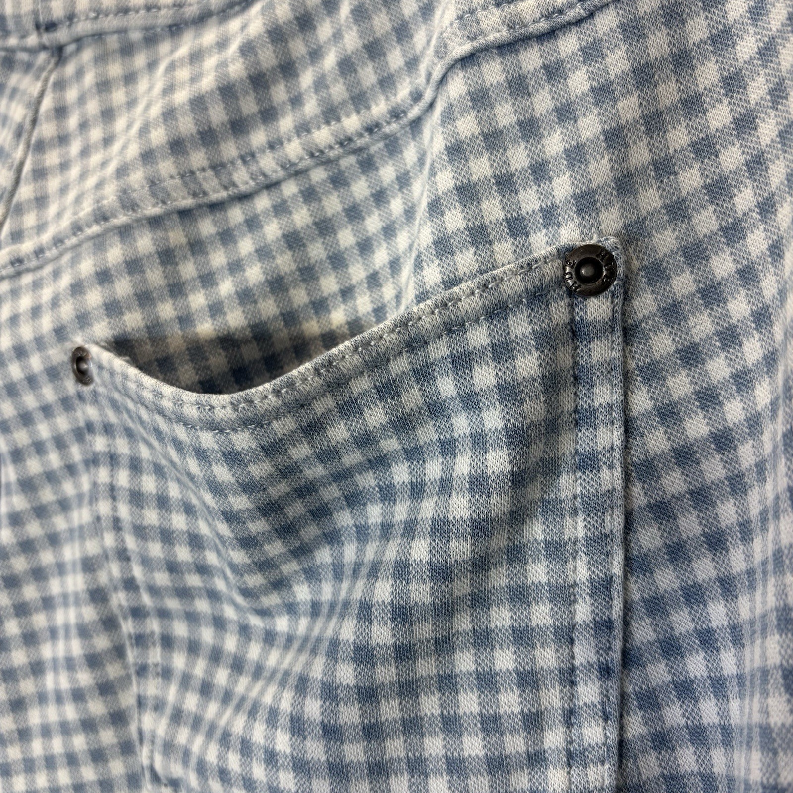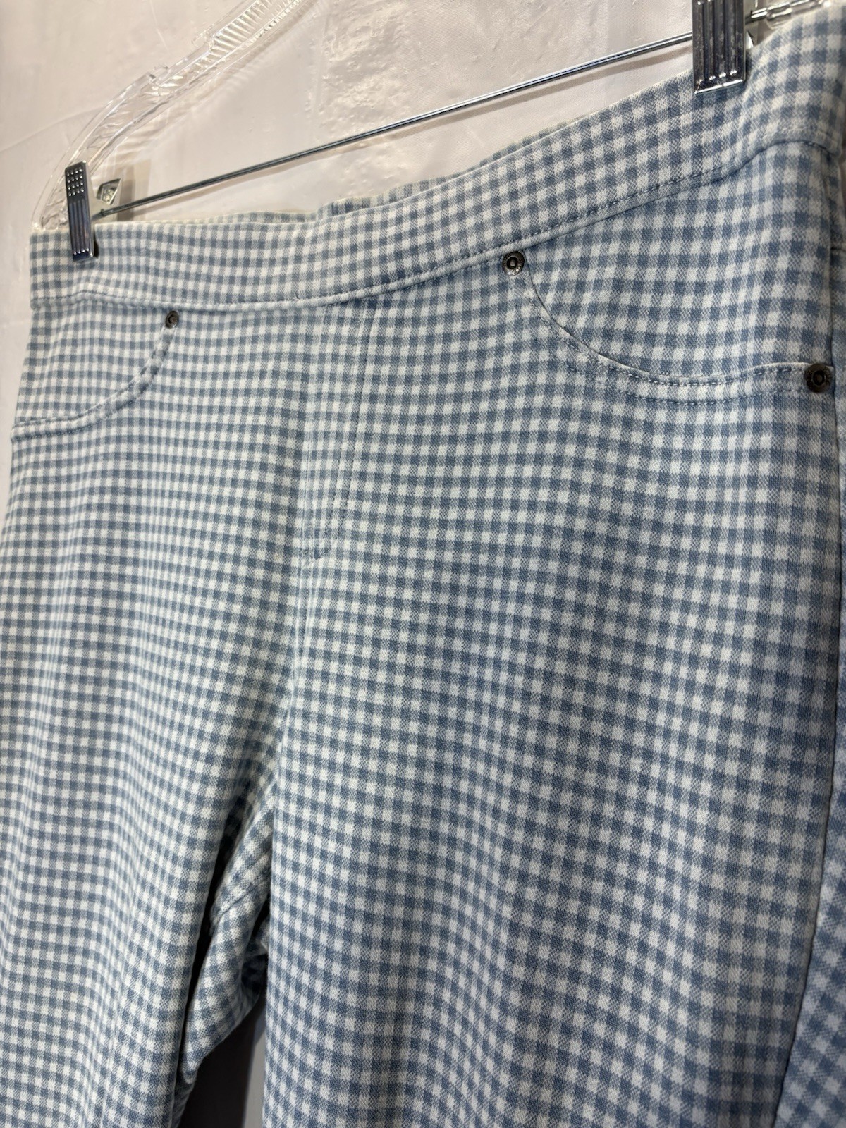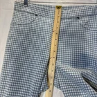 These HUE Brand Women Gingham Stretch Denim Capri/Ankle Leggings in size L are perfect for various occasions such as travel, activewear, or casual outings. Made from a blend of spandex, polyester, and cotton, they offer comfort and stretch for all-day wear. The gingham pattern adds a touch of retro charm, while the high rise and elastic waist ensure a flattering fit. With no front pockets and two back pockets, these lightweight and breathable leggings are easy to care for with machine washable fabric. Ideal for the warmer seasons of summer, fall, and spring, these leggings are a versatile addition to any wardrobe.