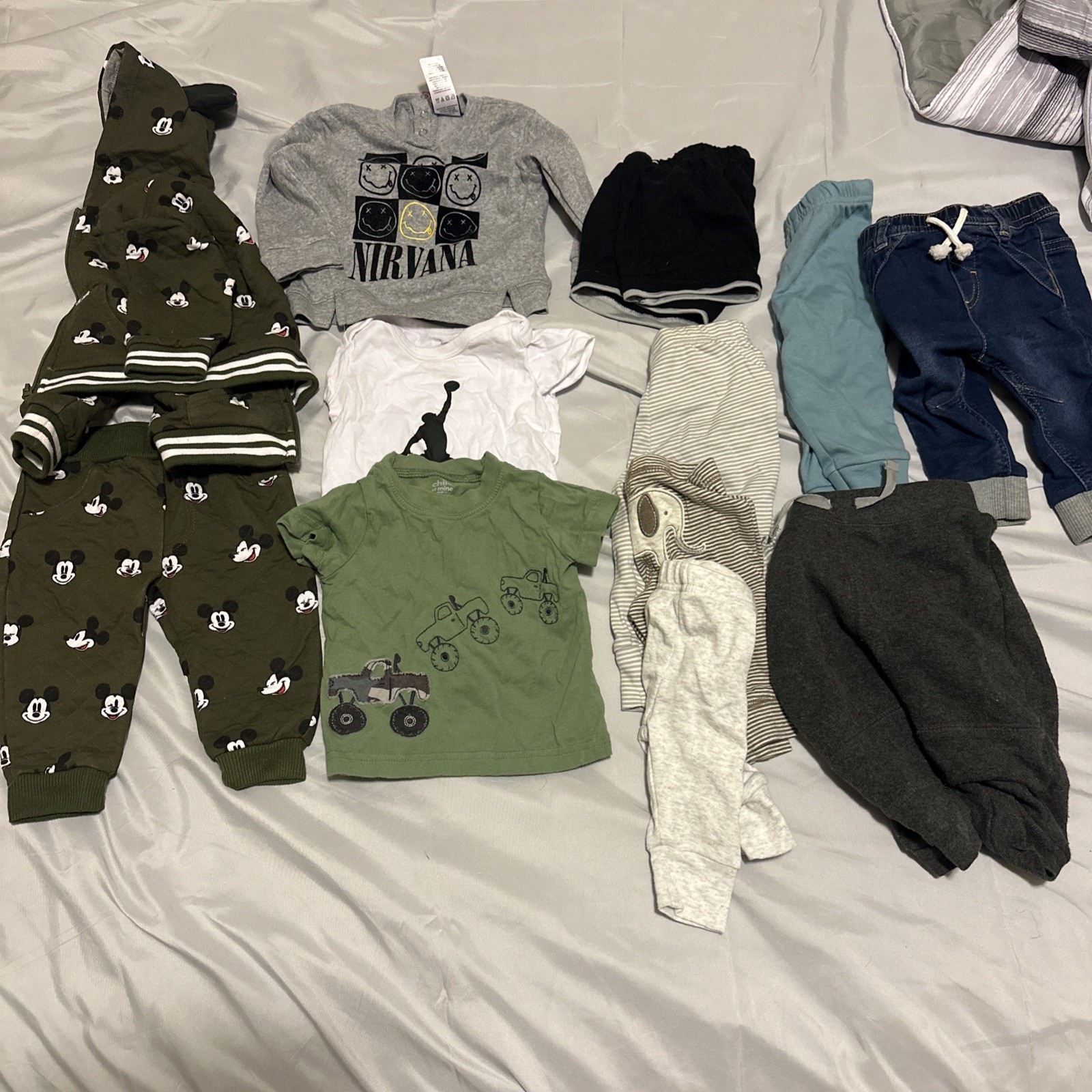 All Clothes are CLEAN and in good condition. 3-6 Months 29 pieces 17 bodysuits 2 shirts 1 Nirvana sweater 1 Disney Mickey Mouse Jacket 1 Disney Mickey Mouse matching pants 1 shorts 6 Pants 6-9 Months 41 Pieces 30 bodysuits 2 long sleeves shirts 1 shirt 2 jeans 1 new cat and jack with tags cargo pants 4 shorts