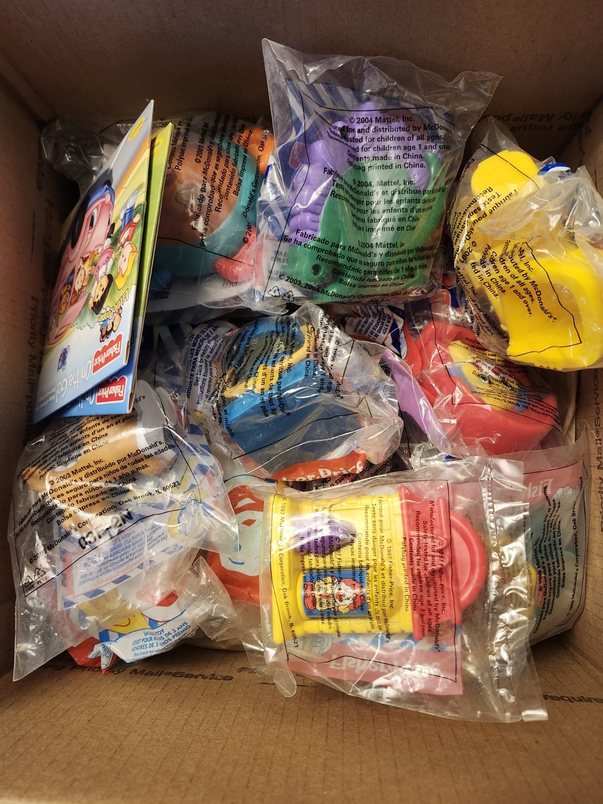 Lot of 21 Unopened McDonald's Happy Meal Toys. Fisher Price, Little People, and others. Lot also includes 2 new children's music CDs.