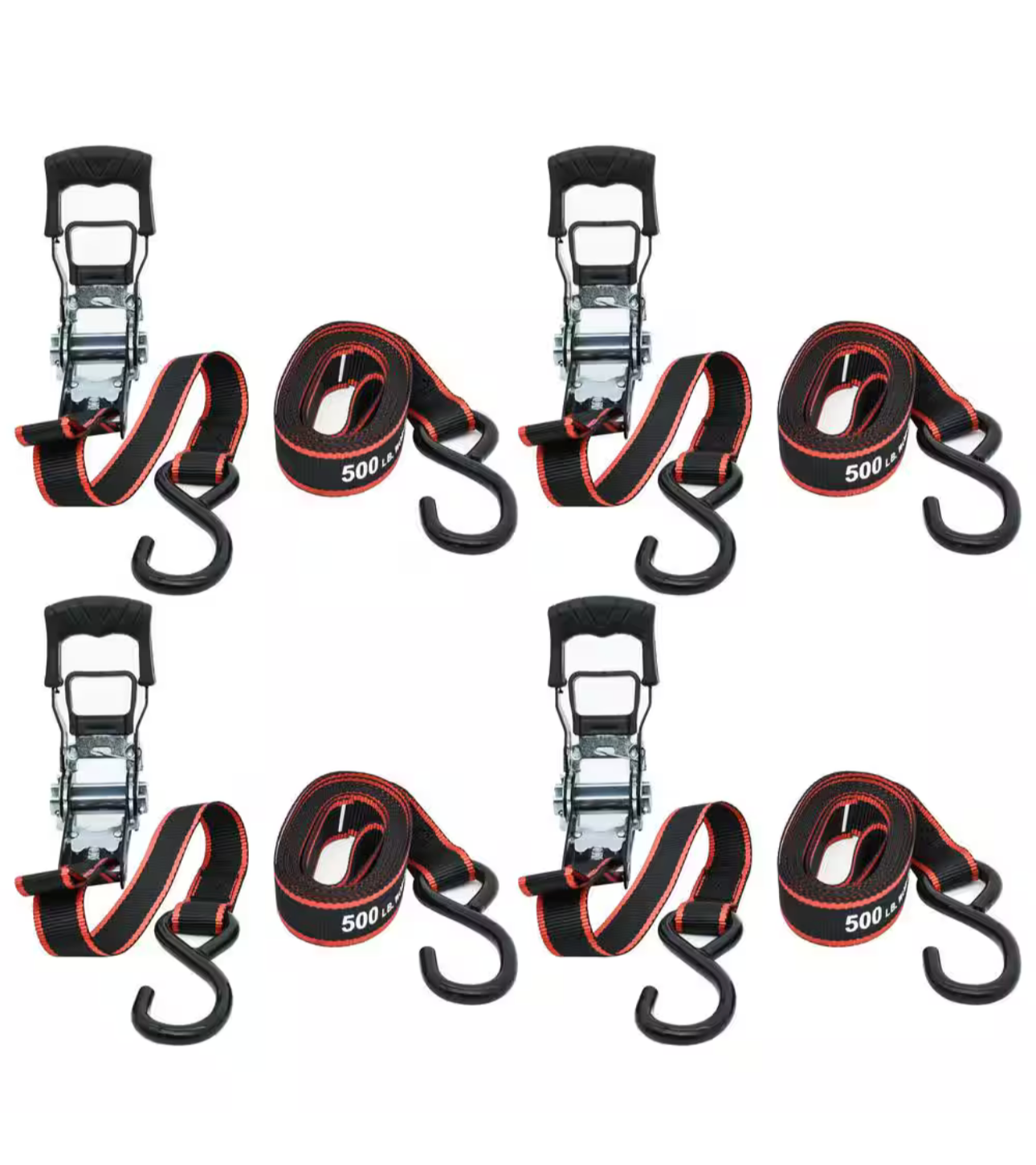 The HUSKY Ratchet Tie-Down Straps 4-Pack is a set of high-quality, weather-resistant straps designed for securing loads up to 500 lbs. Each strap is 12 ft long and 1 inch wide, featuring a quick release hook for easy use. The straps come in a sleek black color and are sold in a convenient 4-pack, making them ideal for various home and workshop applications. Made by a trusted brand in the United States, these ratchet tie-down straps are a reliable and durable solution for any tying-down needs.